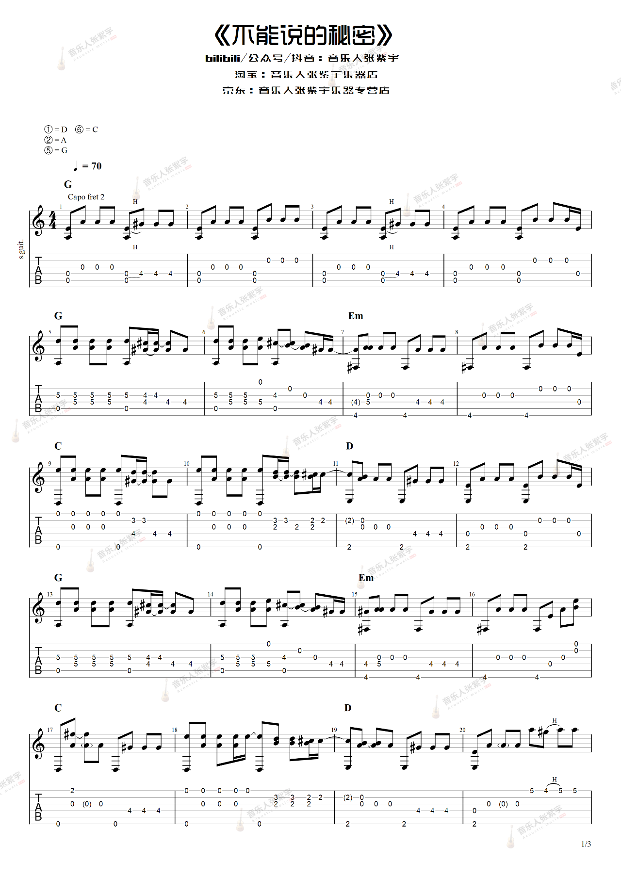 曲谱介绍: 不能说的秘密指弹谱,改编自周杰伦主演同名电影的主题曲《不能说的秘密》,有些感受总会在旋律中慢慢浮现,那些难以忘却的片段,随着旋律。一段段的演绎出了曾经的经典。 本谱共有3张高清图片谱,弹奏速度控制在70拍每分钟,节奏4/4拍,精编的原版指弹曲目,难度5级适中,弹奏过程中,常规的一些音符没有太大的难度,注意一些细节的点缀会是亮点的关键。 指弹谱详情