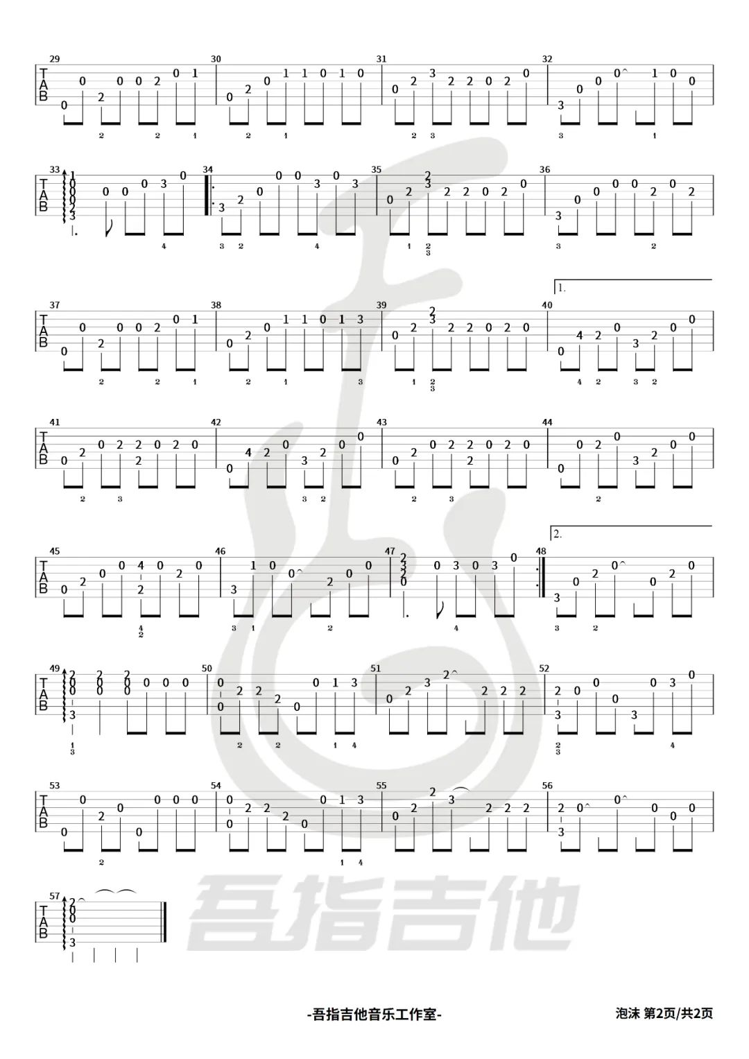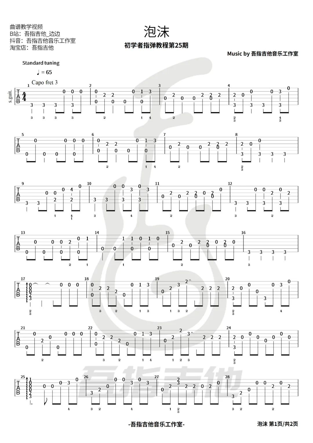 曲谱介绍: 泡沫指弹吉他谱,根据邓紫棋演唱的歌曲《泡沫》所改编的指弹曲目,旋律舒缓婉转,但也不失张力。 本谱共有2张高清图片谱例,弹奏速度控制在65拍每分钟,CAPO夹3品,指弹难度2级较简单,随谱还附指弹演示+教学视频,可供琴友们参考练习。 指弹谱详情