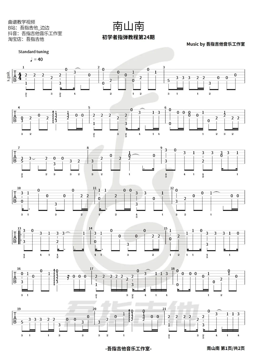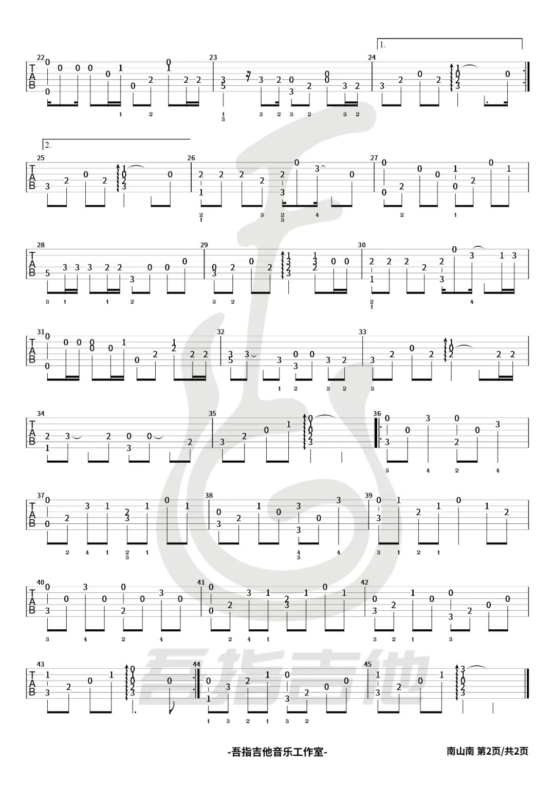 曲谱介绍: 南山南指弹吉他谱,改编自马頔/张磊演唱过的歌曲《南山南》,民谣的韵味用弦乐述说着故事,你是否心中曾经藏着一份难忘的年华回忆,那些时光的分隔总能在心中深深铭刻。 《南山南》指弹谱,共有2张高清图片谱例,速度可以控制在40拍每分钟弹奏,节奏4/4拍,本谱还是比较适合指弹新手练习指法,对于有难处的可以参考视频来结合练习。 指弹谱详情