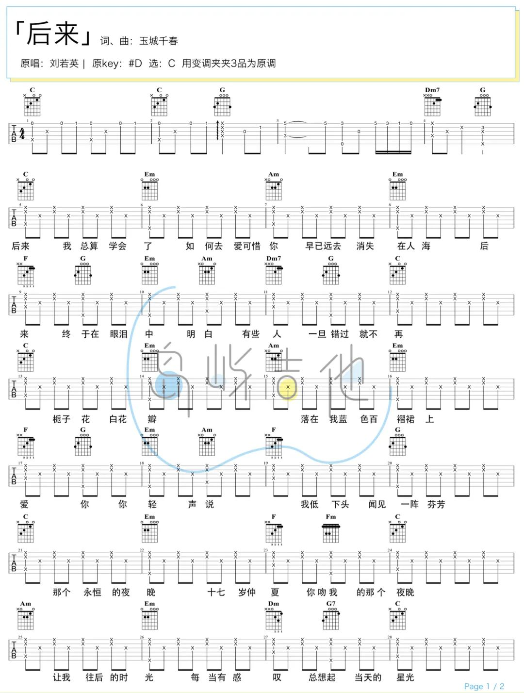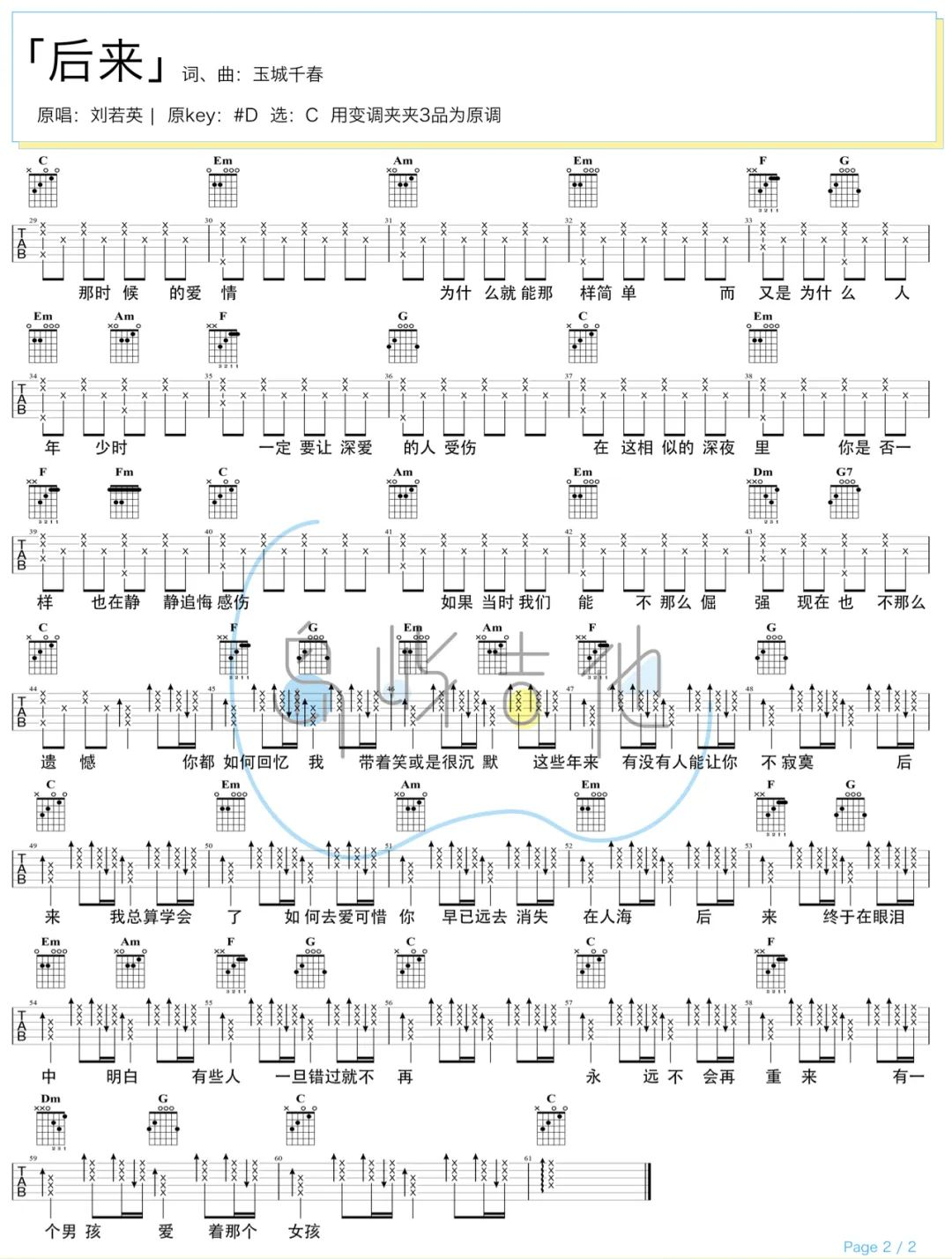 曲谱介绍: 《后来》吉他弹唱教学视频 后来吉他谱,刘若英演唱,一首歌曲点醒了爱过后的后悔。 《后来》吉他弹唱谱,选用C调指法,原调bE,本谱附弹唱演示和教学视频,选用的是1品弹唱,感兴趣的朋友可根据自己嗓音来选择变调夹位置,本谱提供了2张弹唱六线谱+1张和弦谱。