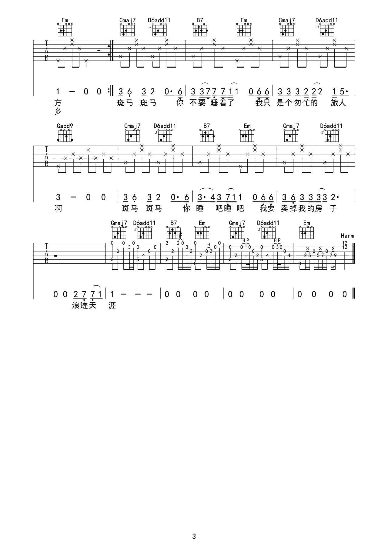 曲谱介绍: 斑马斑马吉他谱,宋冬野演唱的民谣歌曲,伤感曲调唱着心底深处的忧伤。 《斑马斑马》吉他弹唱谱,选用G调指法编配,标准调音弹唱,无需使用变调夹,含完整前奏按原版编配,随谱附本曲的吉他演示+保姆级的教学视频,供大家参考。