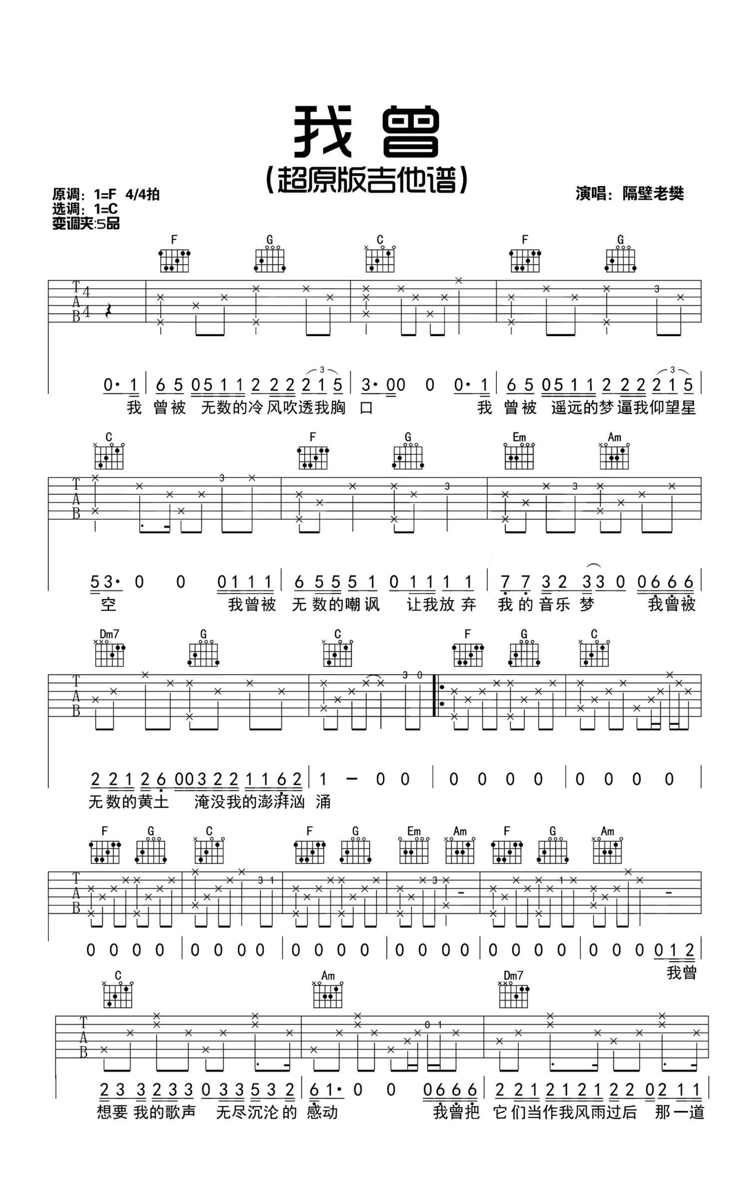 我曾吉他谱 - 隔壁老樊 - C调吉他弹唱谱