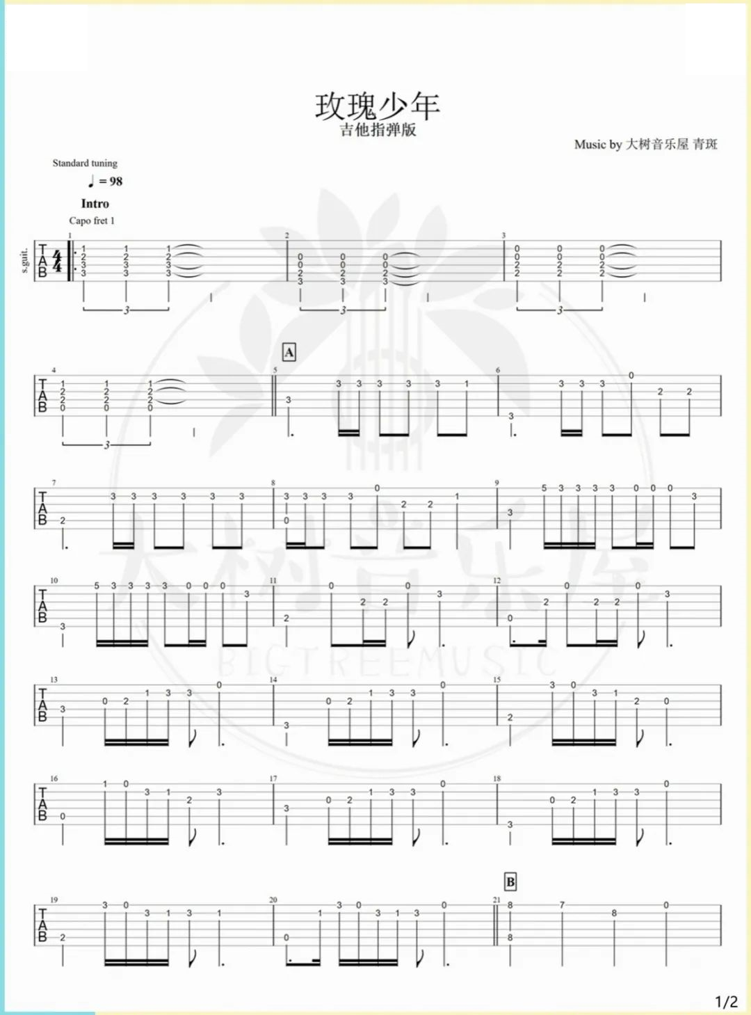曲谱介绍: 《玫瑰少年》指弹教学视频 玫瑰少年指弹谱,根据五月天/蔡依林演唱过的歌曲《玫瑰少年》改编的吉他独奏六线谱,每次听到歌曲的灵魂,总会有种花朵突然绽放的感觉,我们总能在曲中重新找到属于自己的坚毅与热血。 《玫瑰少年》吉他独奏谱,共2张高清图片谱,弹奏速度控制在98BPM,节奏4/4拍,弹奏难度3级较简单,比较适合指弹新手练习,随谱附有演示和教学视频,教学将为大家分前奏、A段、B段讲解。 指弹谱详情