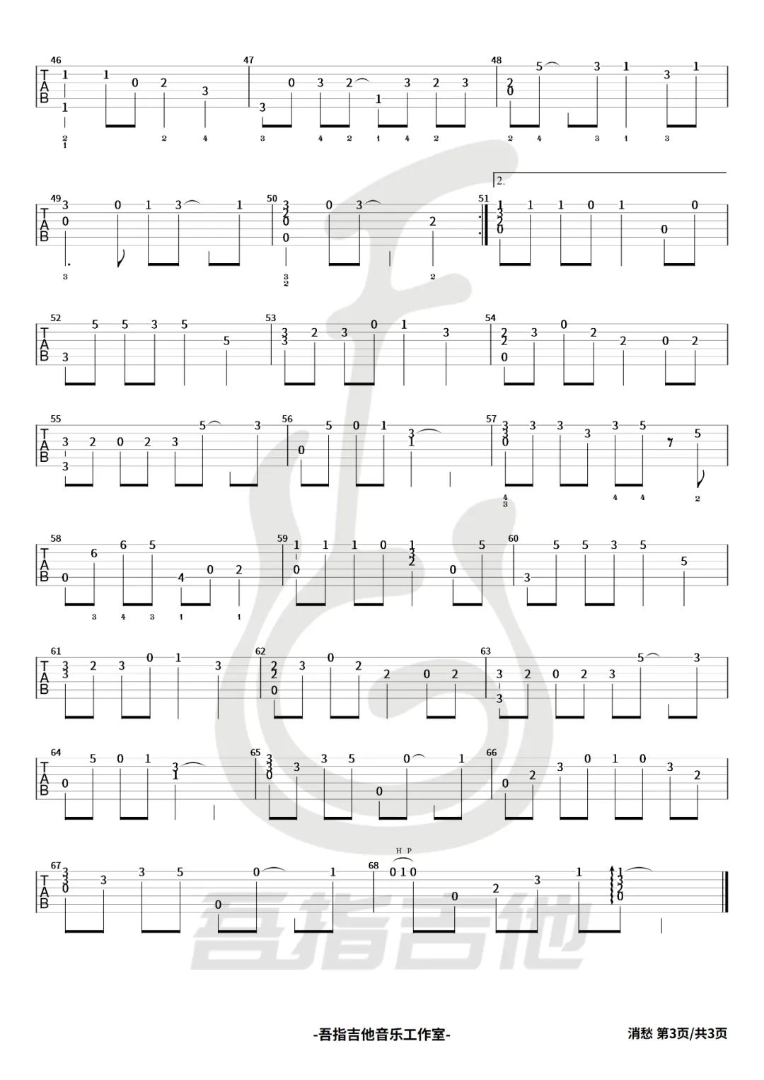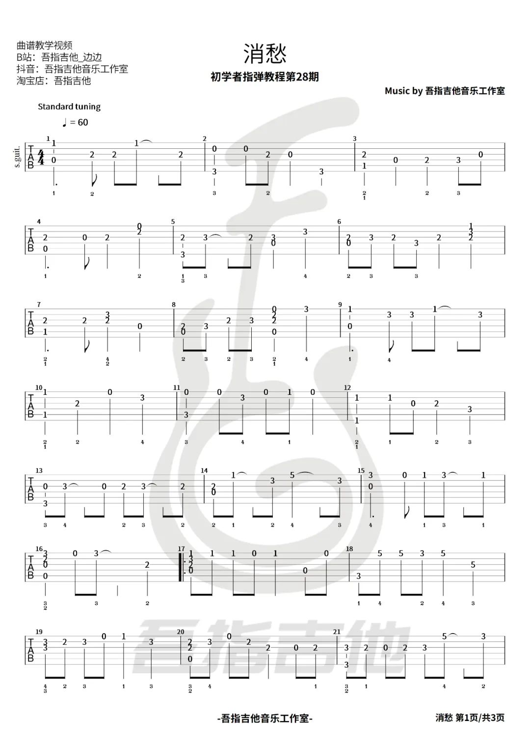 曲谱介绍: 消愁指弹谱,根据毛不易的歌曲《消愁》所改编的吉他独奏六线谱。 《消愁》吉他独奏六线谱,共有3张高清图片谱,弹奏速度控制在60拍每分钟,节奏4/4拍,本指弹谱比较适合新手练习,难度3级较简单,随谱附有演示和教学视频,对指法变换不清楚的琴友,直接参考视频即可。 指弹谱详情