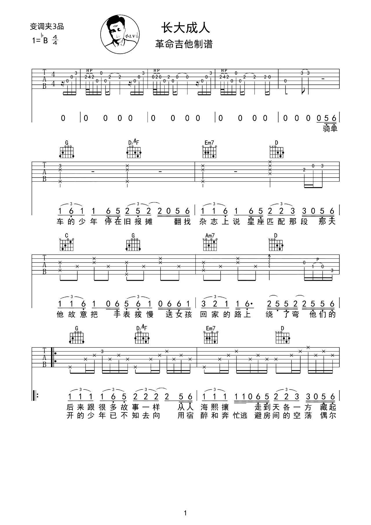 曲谱介绍: 《长大成人》这首歌在网络中爆火,引起极大的共鸣,是它故事感的歌词。 长大成人吉他谱,范茹演唱的一首感人网络歌曲,《长大成人》吉他弹唱谱,选用G调指法,原调bB,节奏4/4拍,CAPO夹3品弹唱原调,含完整前奏按原版编配,难度3级较简单,随谱附演示和教学视频,供大家参考。