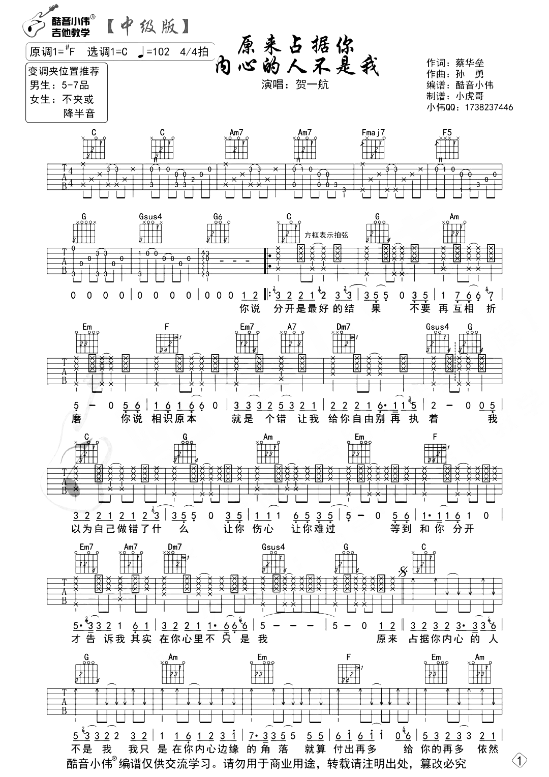 曲谱介绍: 原来占据你内心的人不是我吉他谱,贺一航演唱的歌曲,歌曲舒缓的带着悲伤,像一段真实的悲情剧本呈现给我们。 《原来占据你内心的人不是我》吉他弹唱谱,中级版编配,选用C调指法,原调#F,男生推荐夹5-7品弹唱,女生可不夹或半音,速度控制在102BPM,节奏4/4拍,随谱附演示教学。