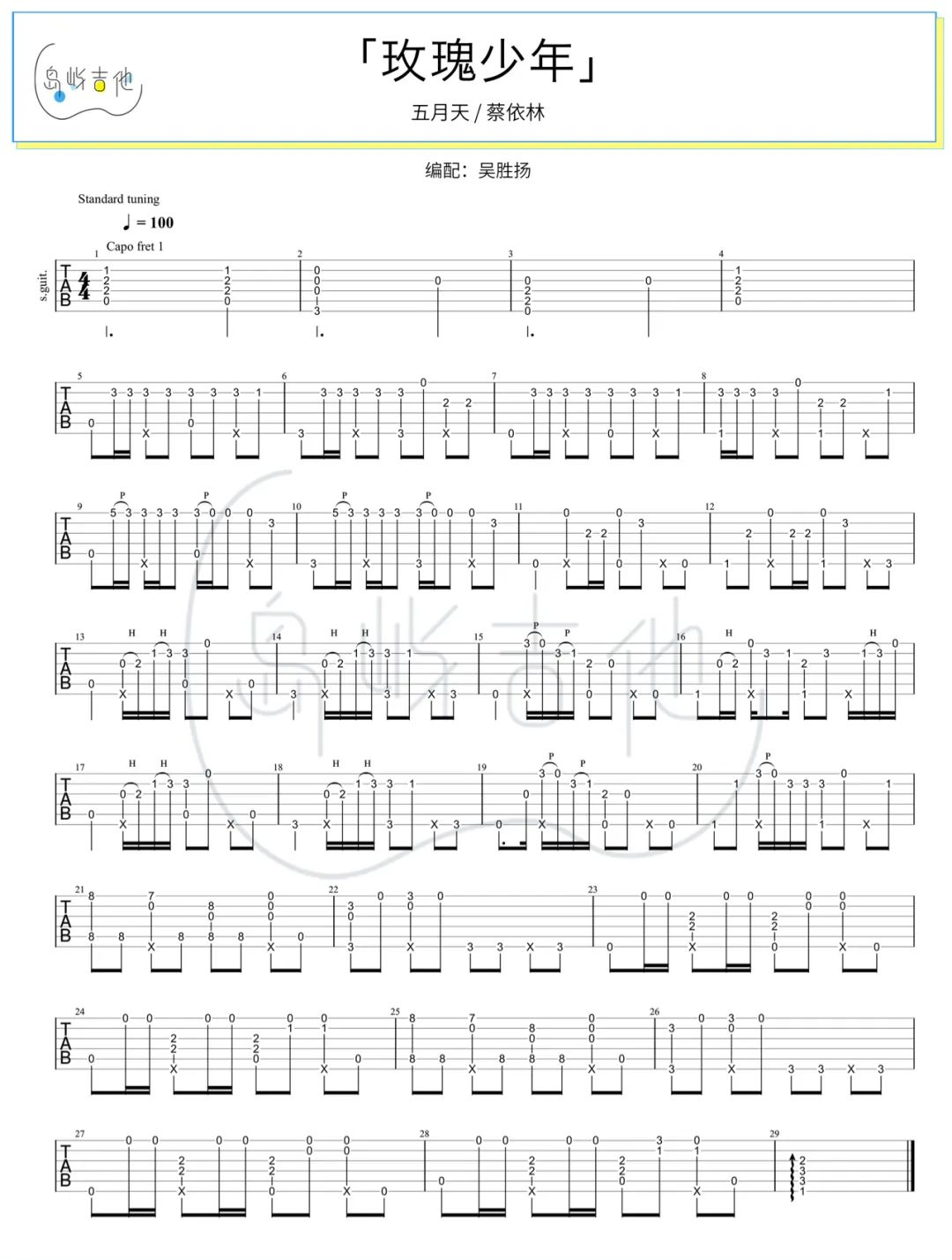 曲谱介绍: 《玫瑰少年》指弹教学视频 玫瑰少年指弹吉他谱,改编自五月天/蔡依林共同创作并演唱过的歌曲《玫瑰少年》,激昂层次的弦乐唱着被压抑着的“少年”,生而为人我们都没有罪,尊重自己让自己值得这个世界,尊重他人让他人也可以活在阳光之下。 本首曲谱共1张高清六线谱图例,弹奏速度控制在100拍每分钟,节奏4/4拍,随谱附《玫瑰少年》的指弹演示和教学视频,感兴趣琴友可参考,另外下方还附有PDF版本的下载。 指弹谱详情
