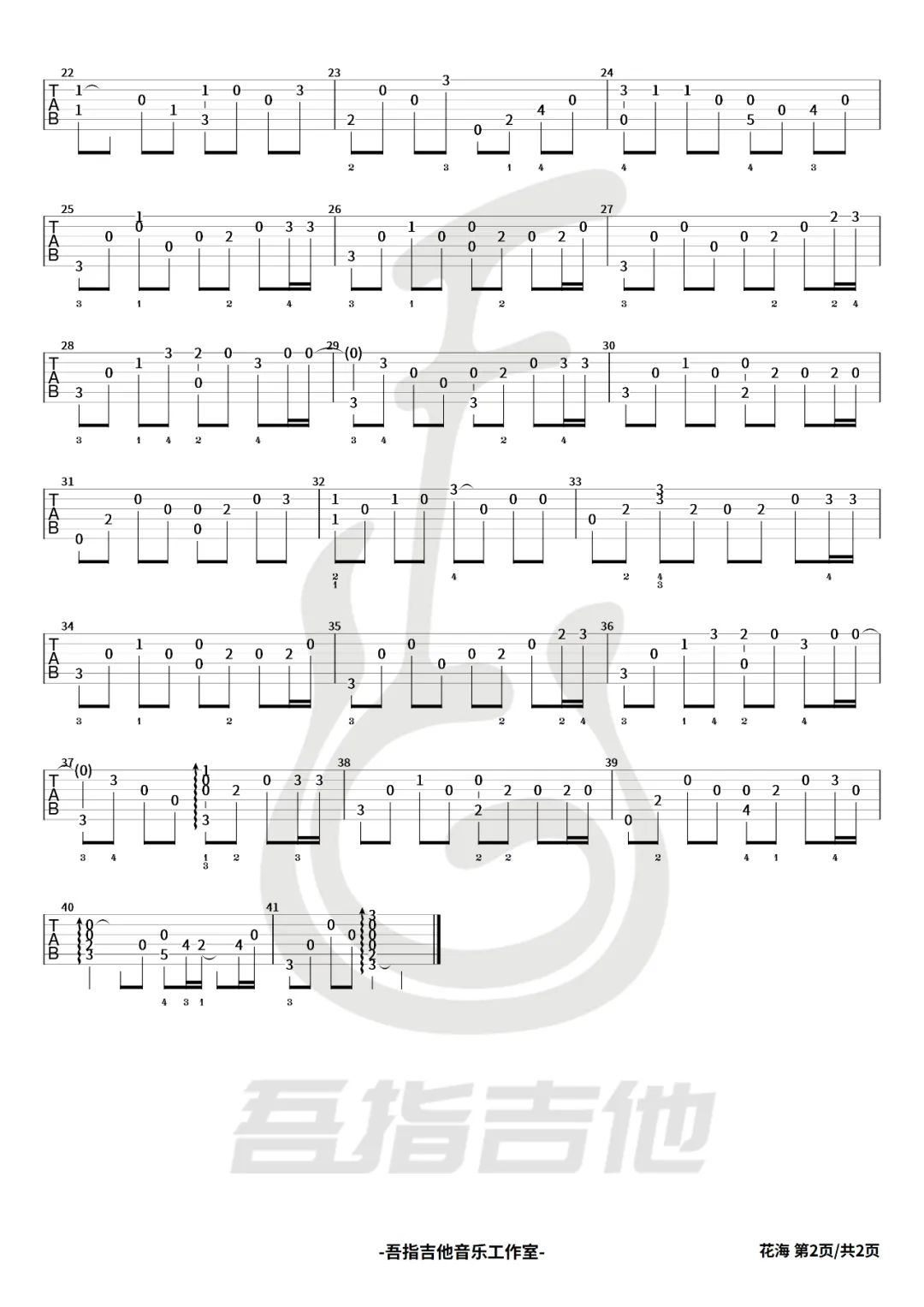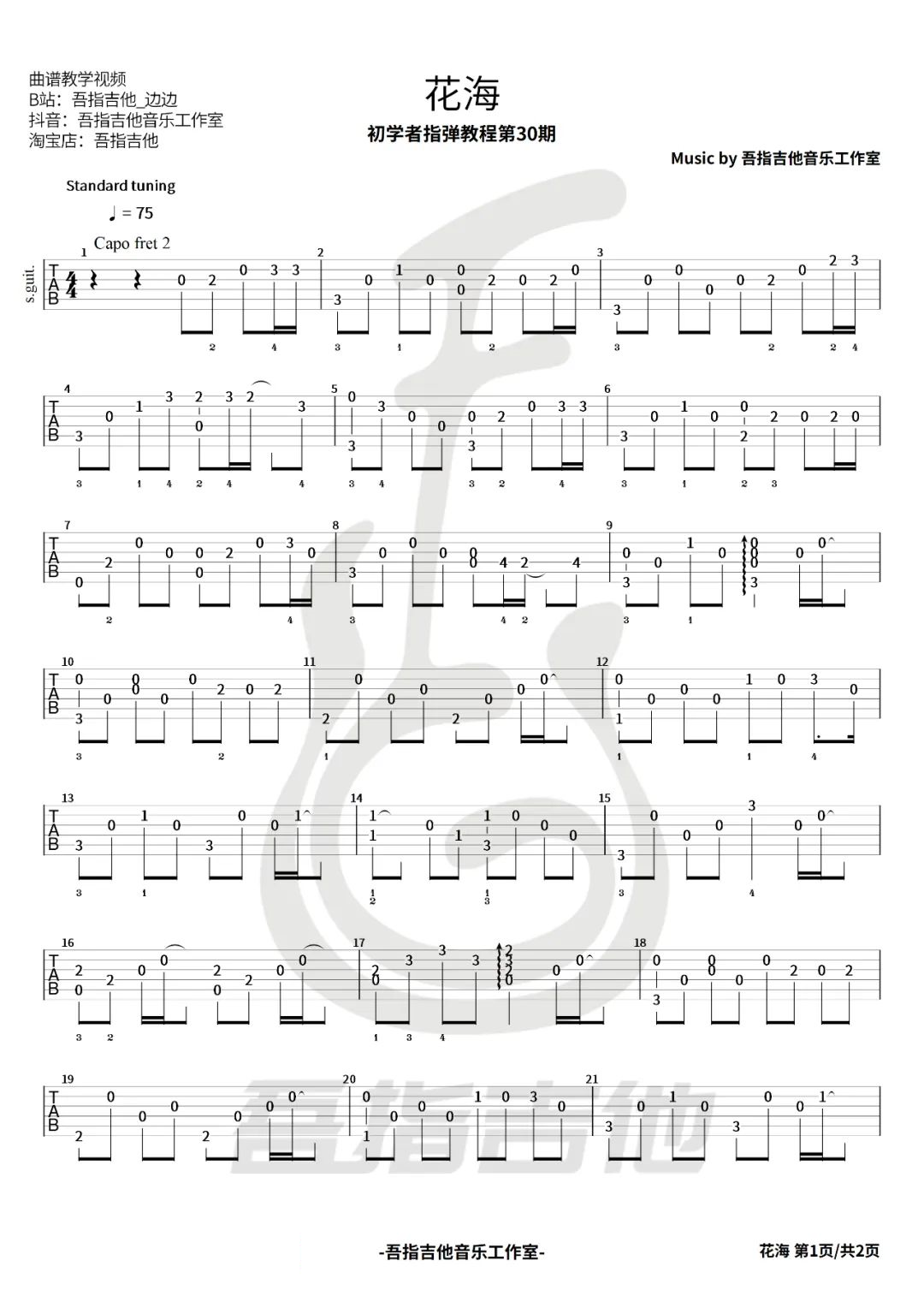 曲谱介绍: 花海指弹谱,根据周杰伦歌曲《花海》所改编的吉他独奏曲目,那份夹杂着忧伤的恬静,在这首歌似乎表达的淋漓尽致,无处不在勾起我们对逝去爱情的追忆。 本指弹谱共有2张高清图谱,弹奏速度控制在75拍每分钟,CAPO可夹2品弹奏,节奏4/4拍,难度3级较简单,随谱附《花海》指弹演示和教学视频,供各位琴友参考。 指弹谱详情