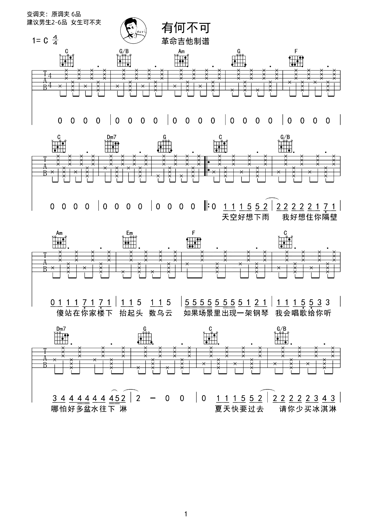 曲谱介绍: 有何不可吉他谱,许嵩演唱的歌曲,这首来自他毕业时的演唱创作,如今却依然这么火,轻快的节奏,甜美的曲风,将我们那些青涩的年岁完好的糅合在了歌曲之中。 《有何不可》吉他弹唱谱,选用C调指法,男生可夹2-6品,女生无需使用变调夹,弹唱难度3级较简单,随谱附本曲的弹唱演示和教学视频,供各位琴友参考。需要PDF版本的可在本页底部下载。