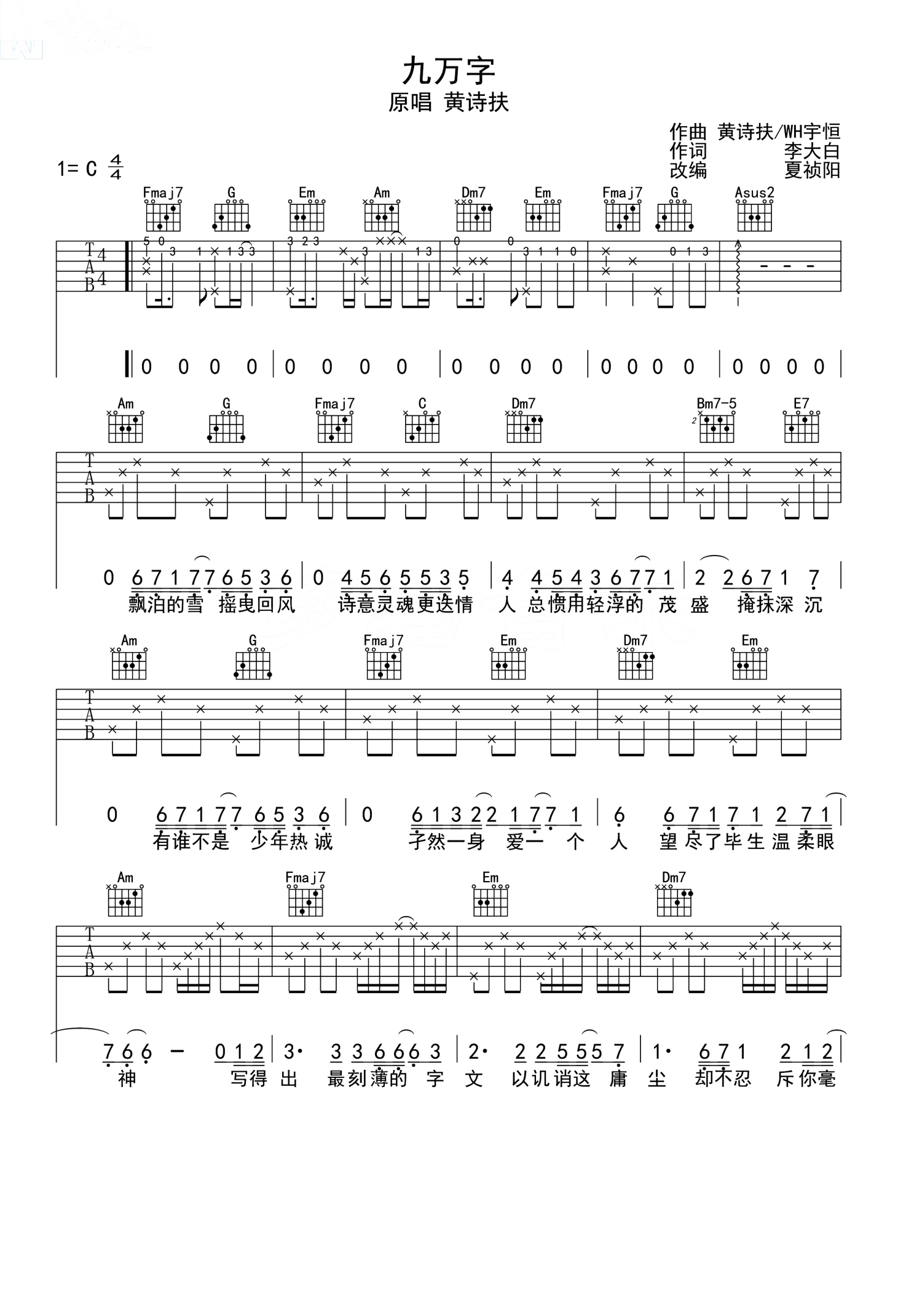 九万字吉他谱 - 黄诗扶 - C调吉他弹唱谱