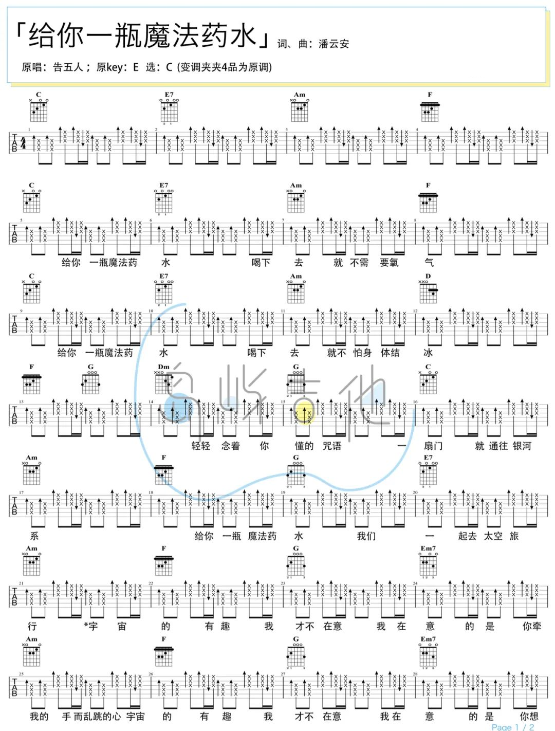 曲谱介绍: 《给你一瓶魔法药水》弹唱教学视频 给你一瓶魔法药水吉他谱,告五人演唱的歌曲,这首歌几乎最近已经热透了,带着点日式调调的味道,从序曲开始就拉满了听众的注意力,让我们在现实的世界中感受着爱情的魔幻。 《给你一瓶魔法药水》吉他弹唱谱,选用C调指法,原调E调,建议夹4品可弹唱原调,共有2张六线谱+1张和弦谱图例,感兴趣的琴友可参考随谱的演示和教学视频。