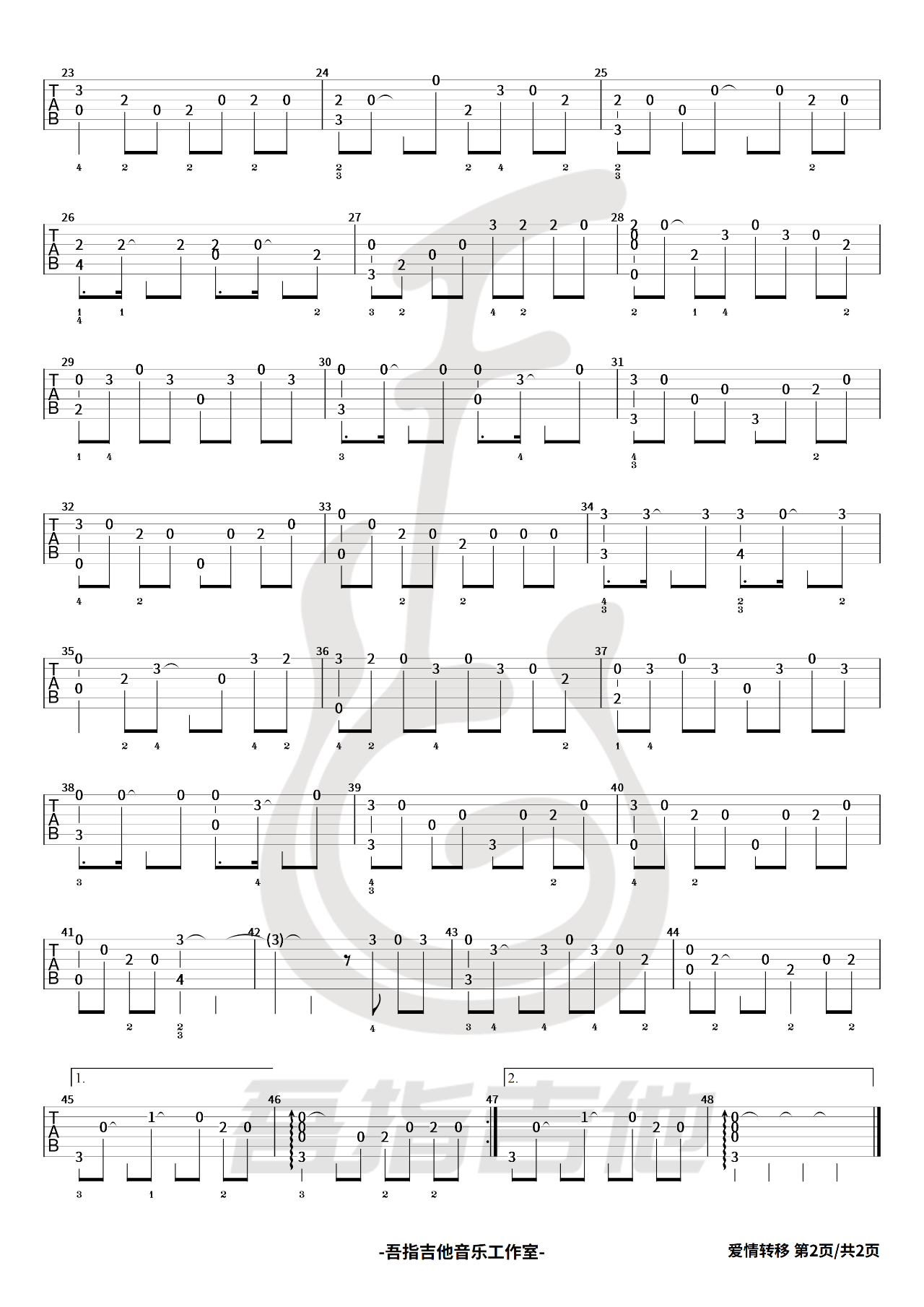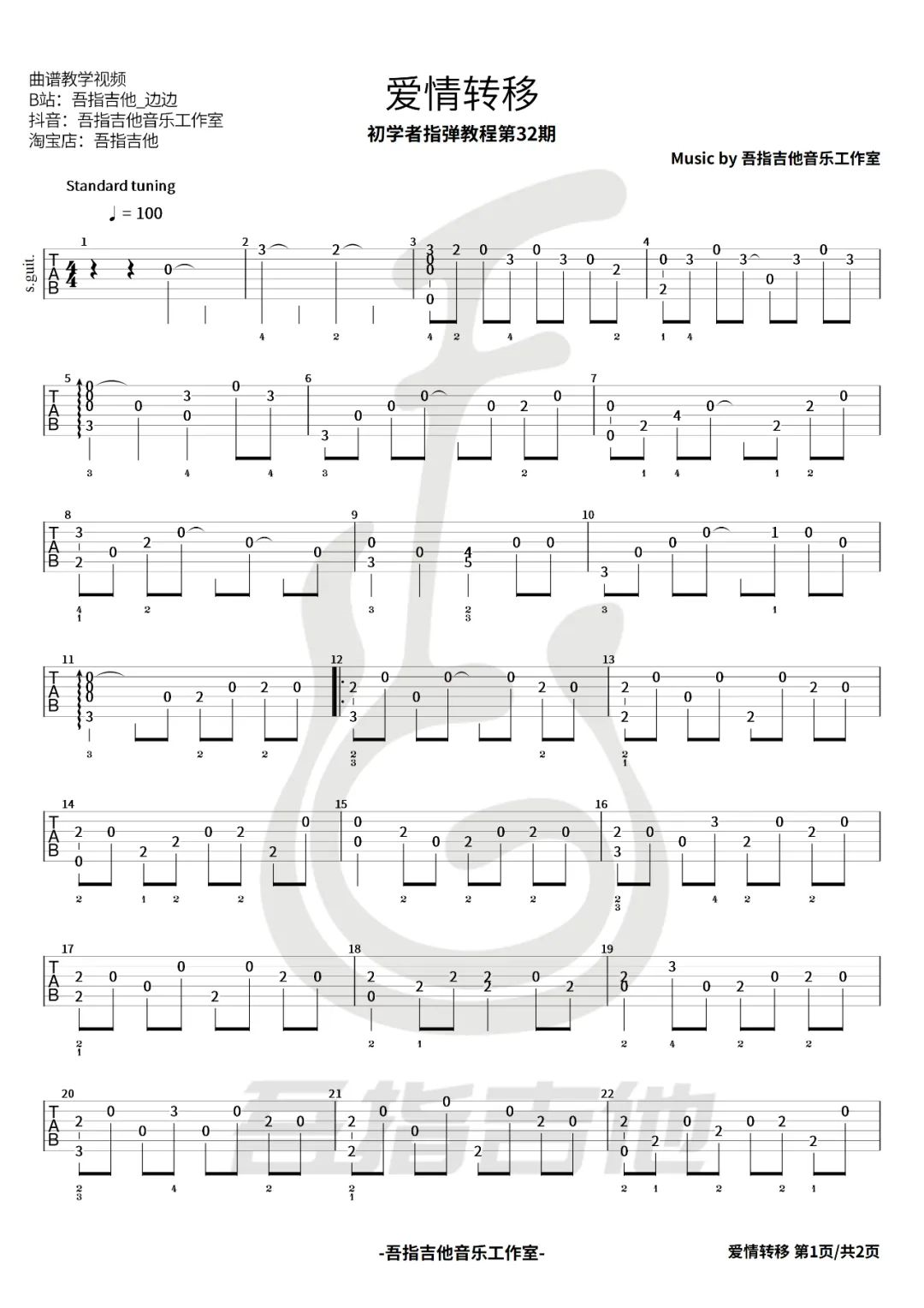 曲谱介绍: 爱情转移指弹谱,陈奕迅演唱电影《爱情呼叫转移》的电影主题曲。 本曲谱共有2张高清图片谱,速度控制在100BPM,节奏4/4拍,随谱附演示教学视频,感兴趣的琴友可参考练习。 指弹谱详情