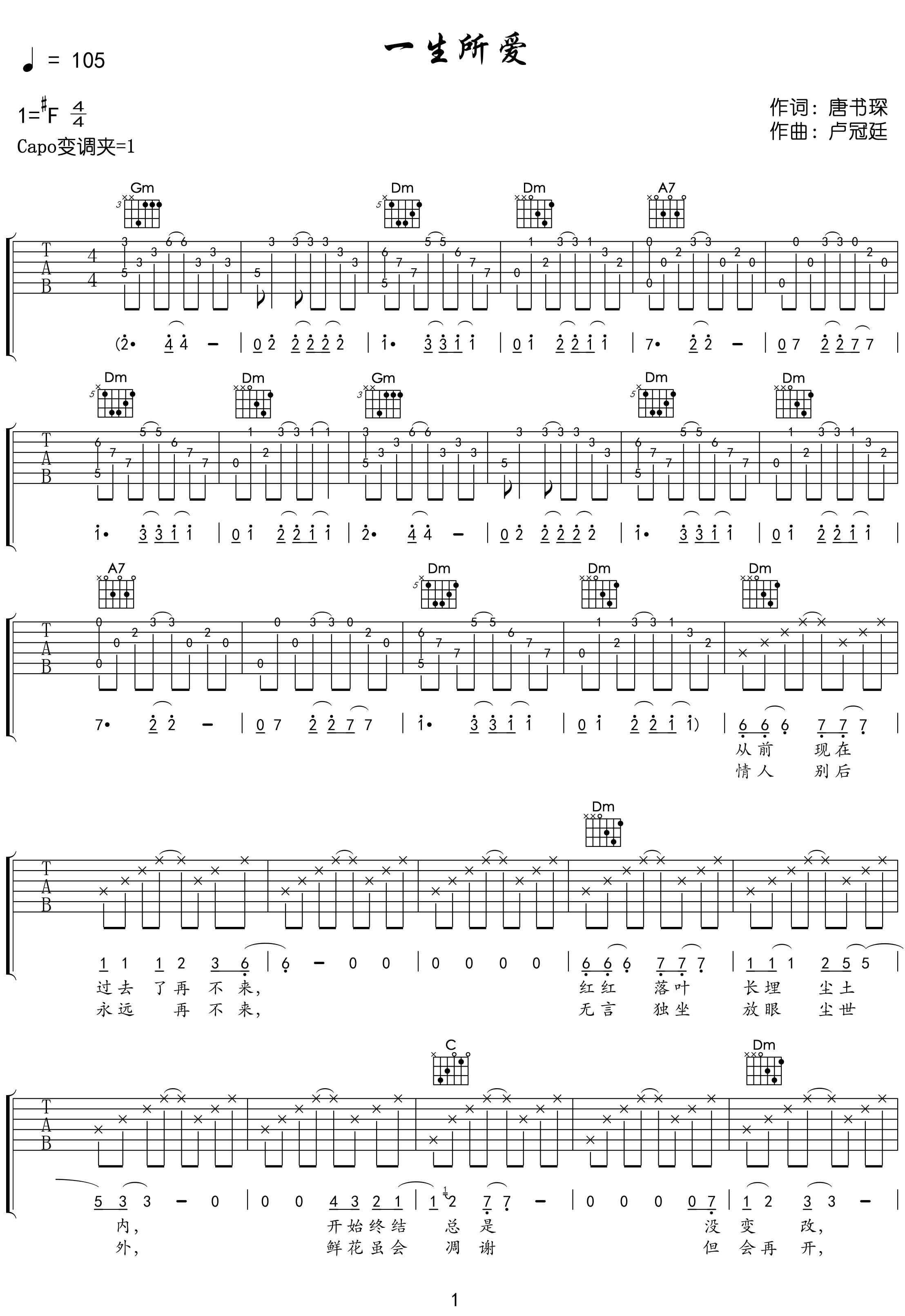 曲谱介绍:   一生所爱吉他谱,卢冠廷演唱《大话西游》片尾曲,每当弦乐响起时,破败的古城楼、逐渐远去的唐僧师徒背影,加上卢冠廷那沙哑、沧桑的歌声,我想多数人都会有种哽咽在心、不能自已的感受。 《一生所爱》吉他弹唱谱,选用F调指法编配,原调#F,CAPO推荐夹1品弹唱原调,速度控制在105BPM,节奏4/4拍,我们见过无数的版本,而这个版本相对更精细,但难度也是略大,感兴趣的琴友可先试听示范音频哦。