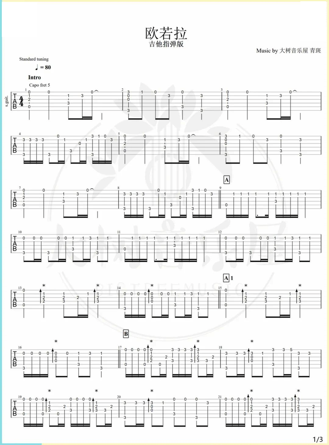 曲谱介绍: 《欧若拉》吉他弹唱教学视频 欧若拉指弹吉他谱,爷回青的时候又到了,这首根据张韶涵代表作改编的独奏曲目,那些五彩斑斓的“欧若拉”,被重新挖掘出来,呈现于大家眼前,也许指弹的感觉,会让你感觉到歌曲不一般的灵性。 本曲谱共有3张高清六线谱,弹奏速度控制在80BPM,节奏4/4拍,CAPO推荐夹5品弹奏,指弹难度4级较简单,随谱附演示和教学视频,供琴友参考练习。 指弹谱详情