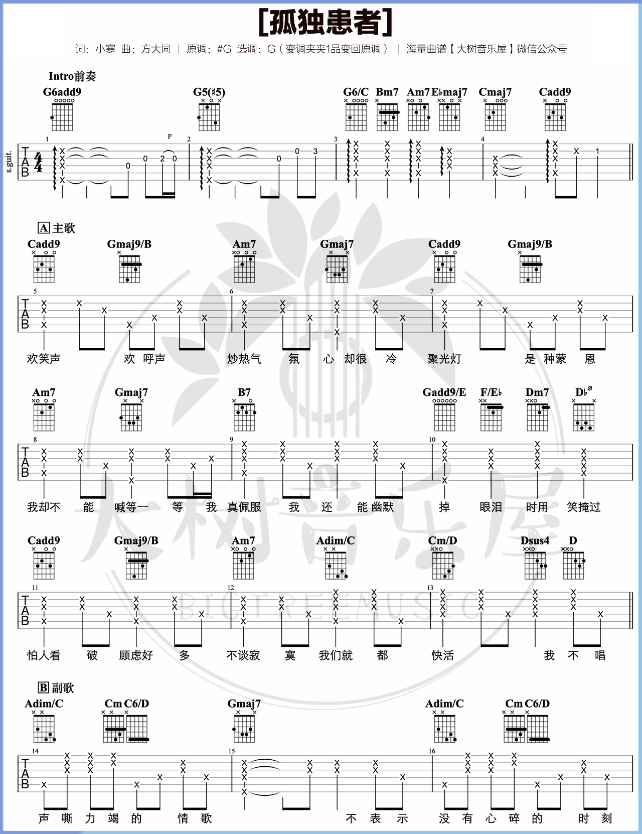 曲谱介绍: 弹唱教学视频 孤独患者吉他谱,陈奕迅演唱的悲伤歌曲,低沉而入心的旋律,唱着喜欢在感情中叹着悲伤的群体,但其实有的时候世界其实并不孤独,孤独的是自己的缺失内心。 《孤独患者》吉他弹唱谱,选用G调指法,原调#G,CAPO夹1品弹唱原调,共有2张高清六线谱+1张和弦谱,随谱附演示和教学视频,