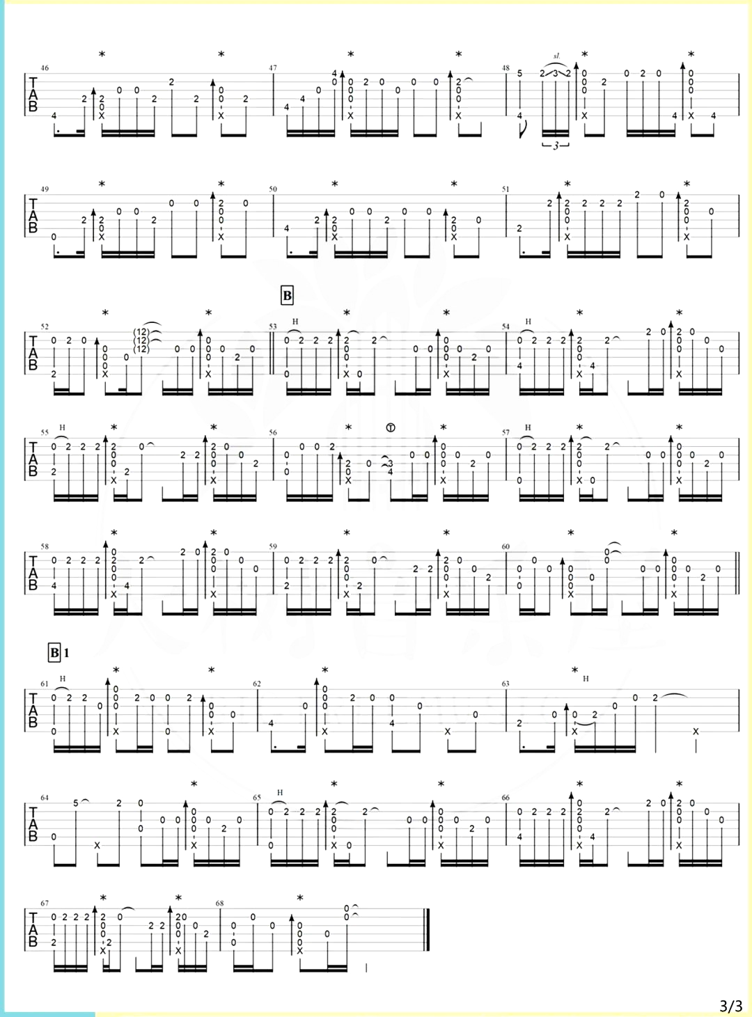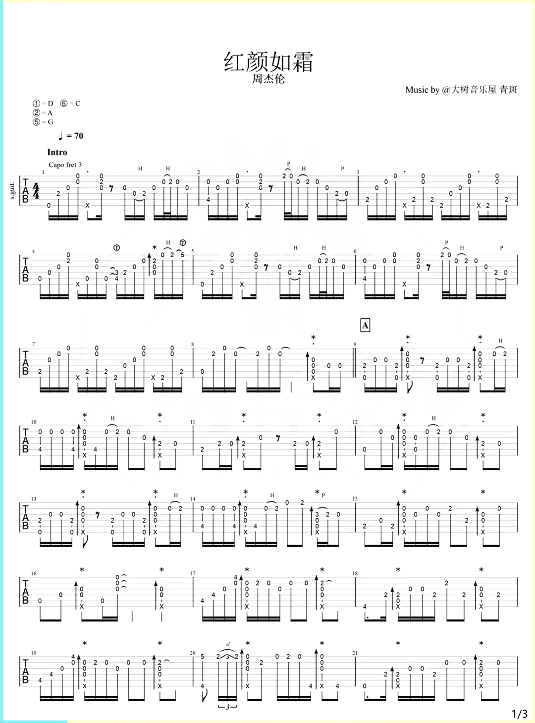 曲谱介绍: 红颜如霜指弹吉他谱,根据周杰伦演唱的歌曲所改编,这首歌是新专辑中让人印象颇深的古风歌曲,背景题材是取自于梨园名剧《凤秋凰》,整首歌的流行与戏剧的完美融合,有不少让人耳目一新的亮点。 本指弹谱,共有3张高清图片谱例,弹奏速度控制在70拍每分钟,节奏4/4拍,随谱附指弹演示视频,供琴友参考练习。另外在本页下方有此版本的PDF下载哦! 指弹谱详情