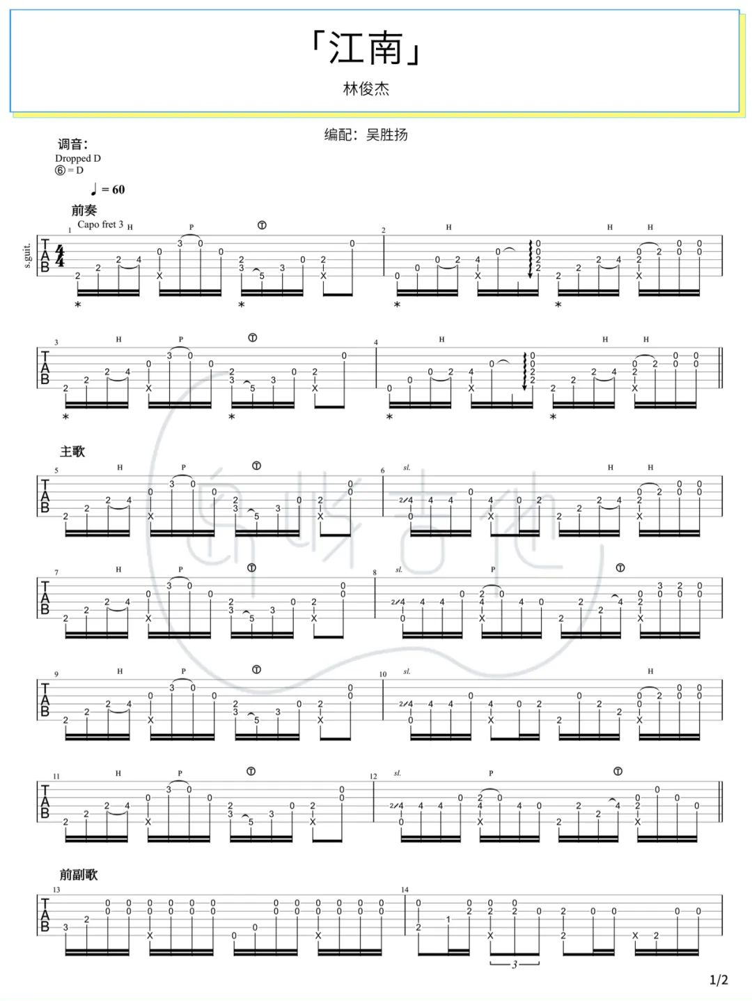 曲谱介绍: 指弹教学视频 江南指弹谱,根据林俊杰演唱的经典歌曲《江南》所改编,婉转的曲风,古味中透出了淡淡的烟雨味道,每当场景入眼,总会勾起我们难以平复的情绪,那些年那些事,也许总会随之而来。 本曲谱共有2张高清图片谱,弹奏速度控制在60拍每分钟,节奏4/4拍,随谱附本曲的指弹演示教学视频,需要PDF版本下载的可以在本页下方找到。 指弹谱详情