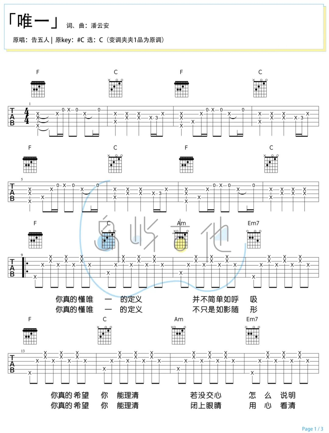 曲谱介绍: 弹唱教学视频 唯一吉他谱,台湾宝藏乐队告五人演唱的歌曲,空灵感的感觉,仿佛用安静的方式述说着彼此的内心,“你真的懂唯一的定理”,一字一句都融化了内心,也许我们曾经听过不一样的《唯一》,但这首歌曲也许是能够走心的那一款。 《唯一》吉他弹唱谱,选用C调指法,原调#C,共有3张高清六线谱,1张和弦谱,简易原版编配,随谱附演示+教学视频,供大家参考。本曲谱的PDF可在本页下方下载。