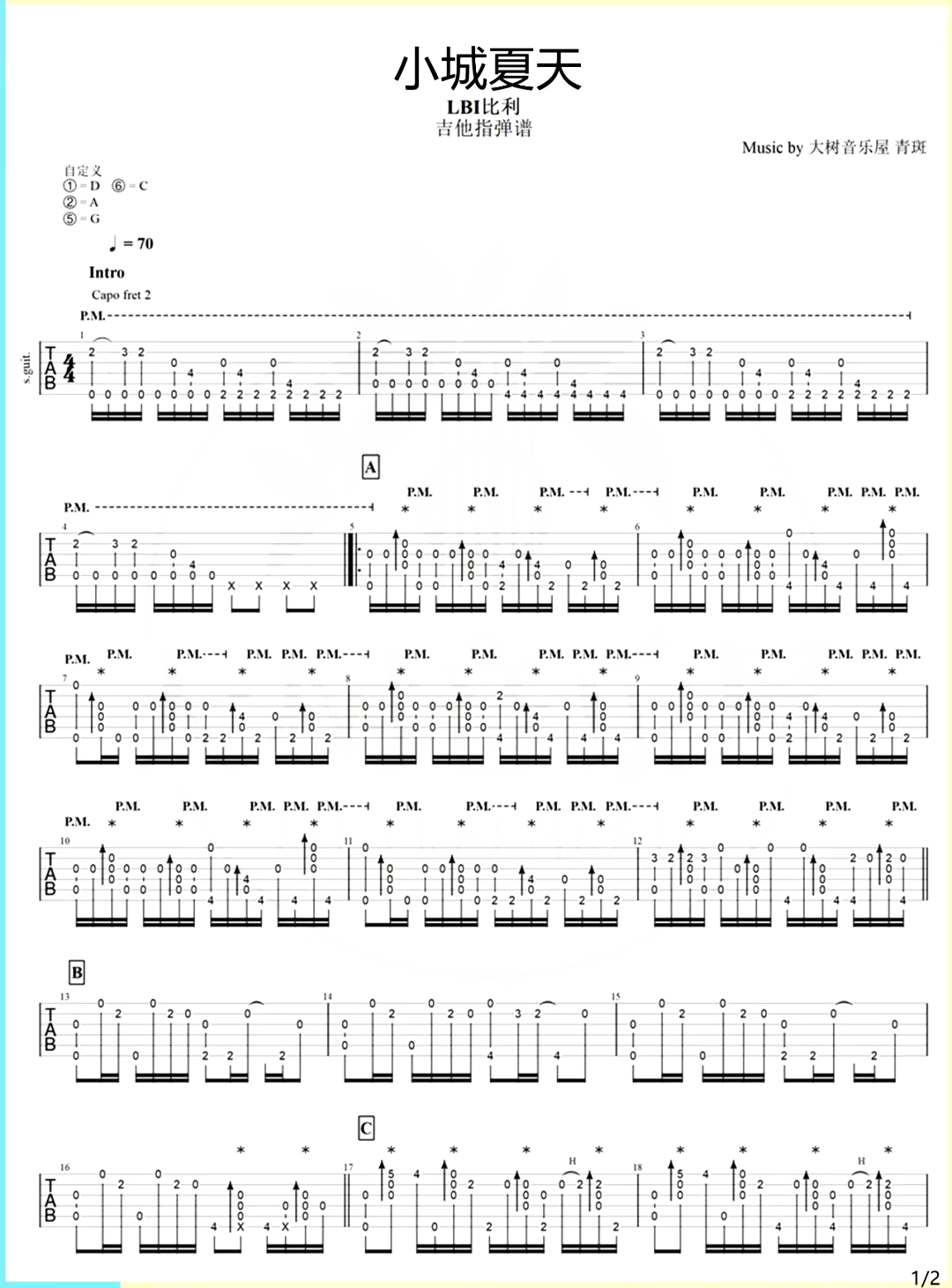 曲谱介绍: 指弹教学视频片段 指弹教学总共分为了5个片段,第一部分主要是针对特殊调弦和前奏部分的讲解,后面分为了A、B、C、D四个片段,是针对整首指弹曲子的一个拆分讲解。 小城夏天指弹吉他谱,由LBI演唱的一首律动快歌,在这个夏季,这首歌曲欢快的节奏燃爆了整个网络,正是这样无忧无虑的快乐感受,才是我们在烦躁社会所向往的境地! 本首指弹谱,弹奏速度控制在70拍每分钟,节奏4/4拍,难度5级适中,随谱附有演示和教学,感兴趣的琴友可参考结合练习。另外,在下方附有PDF版本下载。 指弹谱详情