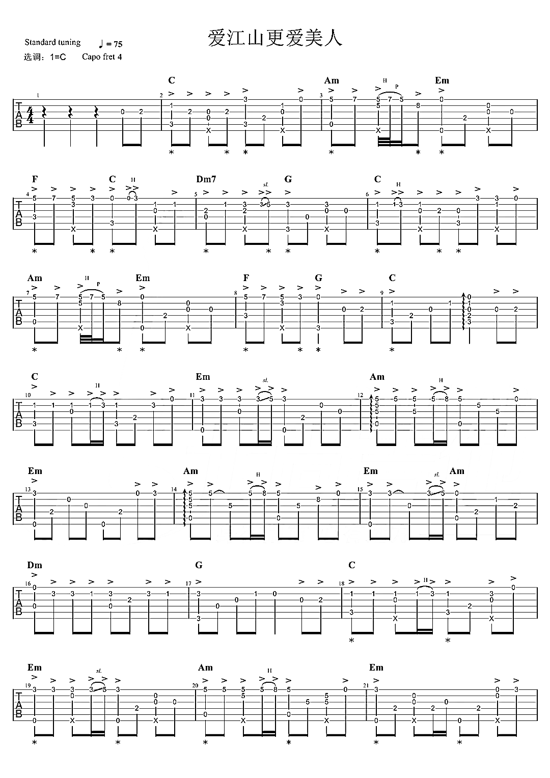 曲谱介绍: 爱江山更爱美人指弹吉他谱,原唱李丽芬,小阿枫翻唱了较火的男版,也是94版《倚天屠龙记》片尾曲,朴素的造词手法,却依然保存着古诗词的底蕴,围绕着江山与美人,演绎着永远经典的故事话题。 曲谱共有1张高清六线谱,选用C调指法,CAPO夹4品是匹配的小阿枫的E调版本,随谱附演示视频,建议亲友们参考后练习,会更易上手! 指弹谱详情
