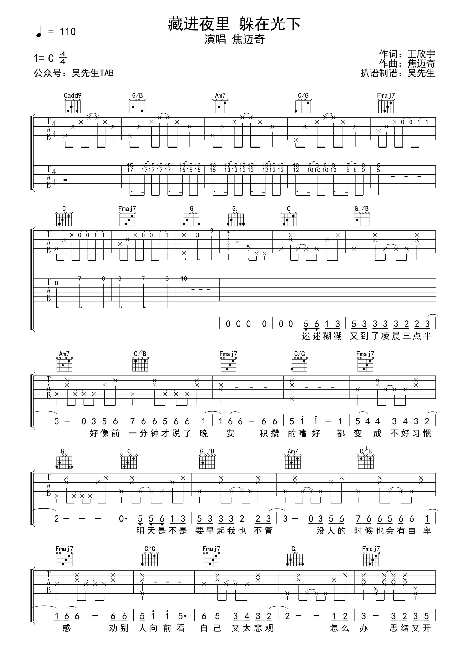 • 藏进夜里躲在光下吉他谱 - 焦迈奇 - C调吉他弹唱谱第1张