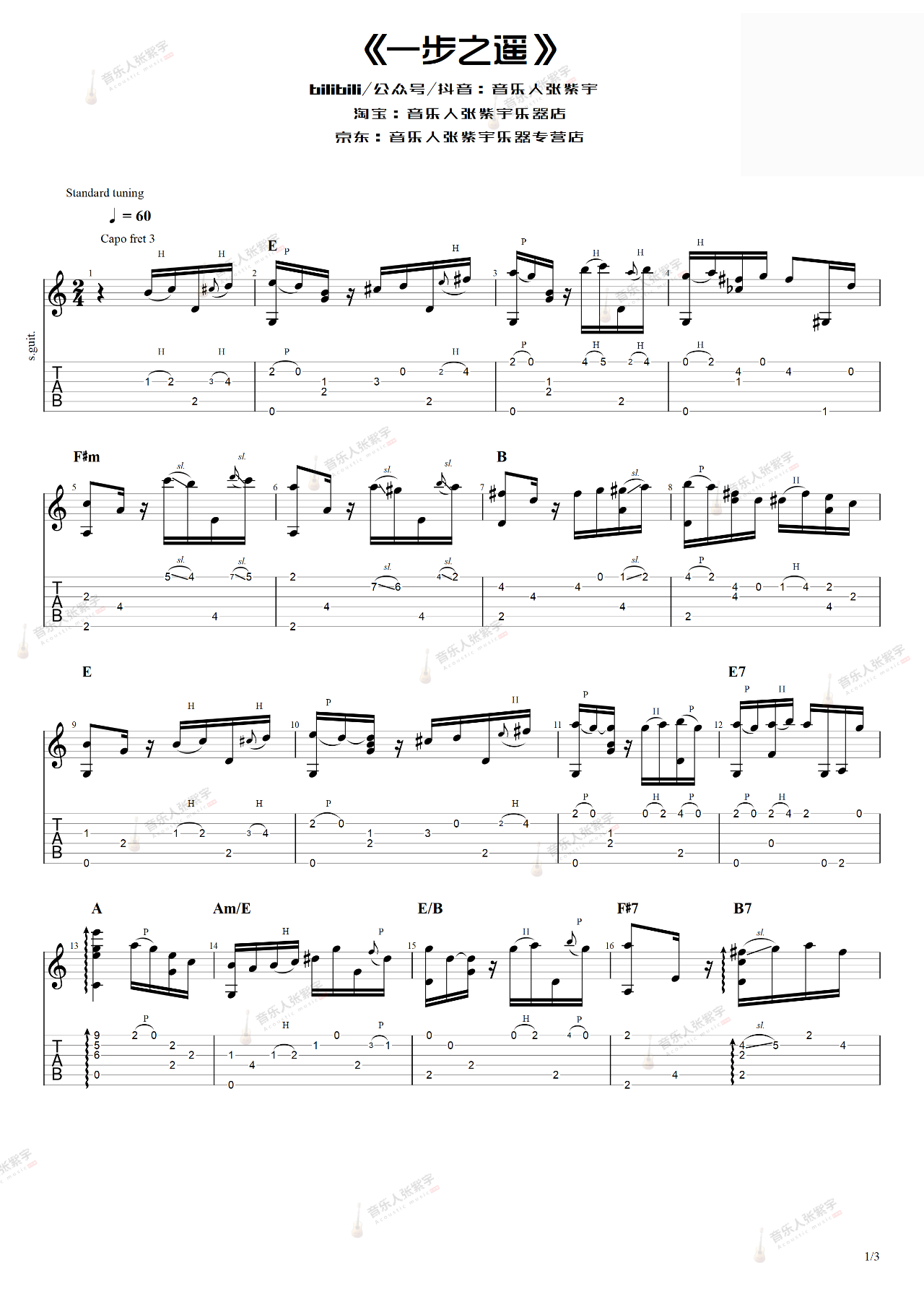 曲谱介绍: 一步之遥指弹吉他谱,根据西班牙探戈提琴名曲所改编的版本,旋律既有跳跃的感觉,也有平缓的舒适感,结合起来感受这优美的节奏,非常的舒心! 曲谱中大量的技巧是用“击弦”和“勾弦”做了相应的点缀,也正是本曲的和弦,弹奏速度需要控制在60BPM,节奏2/4拍,具体如果有难度可参考视频来结合练习。
