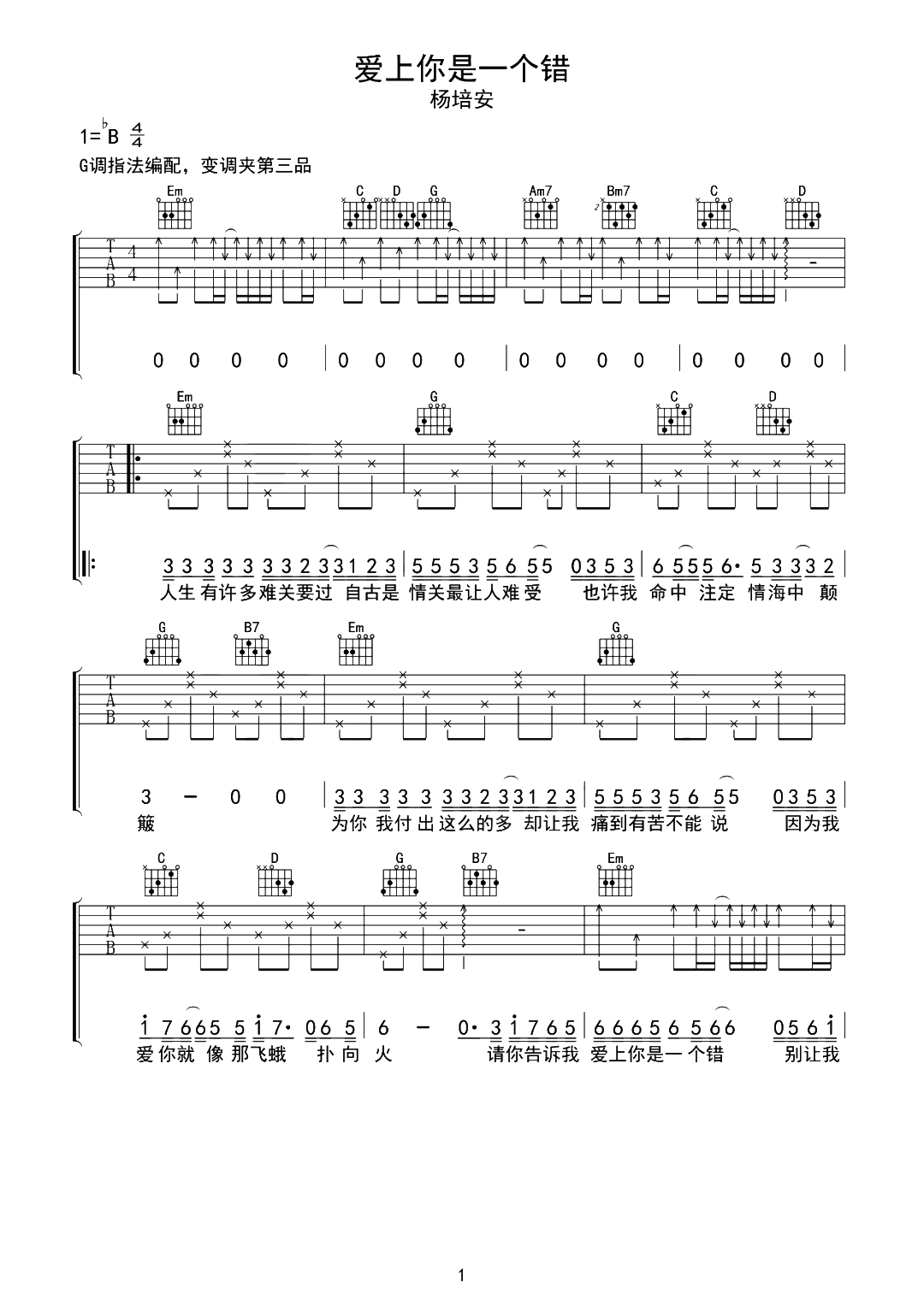 曲谱介绍: 《爱上你是一个错》吉他谱,杨培安演唱,最近在网络又被翻火的歌曲。深情的演唱,抒发出对爱情的渴望,诠释了伤心难过的感受,表达自己一往情深,唱出了爱情爱恨情仇。 《爱上你是一个错》吉他弹唱谱,选用G调指法,CAPO夹3品弹唱原调bB,含前奏完整原版编配,建议练习前参考下方弹唱演示视频。本页下方还附曲谱的PDF版本下载。