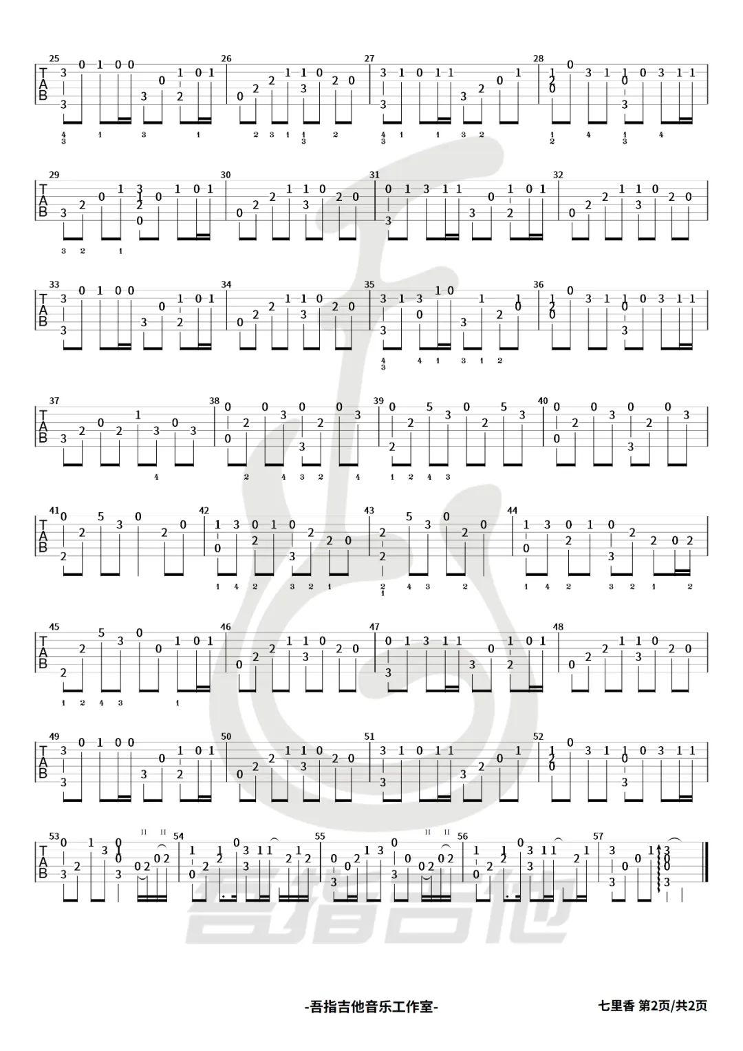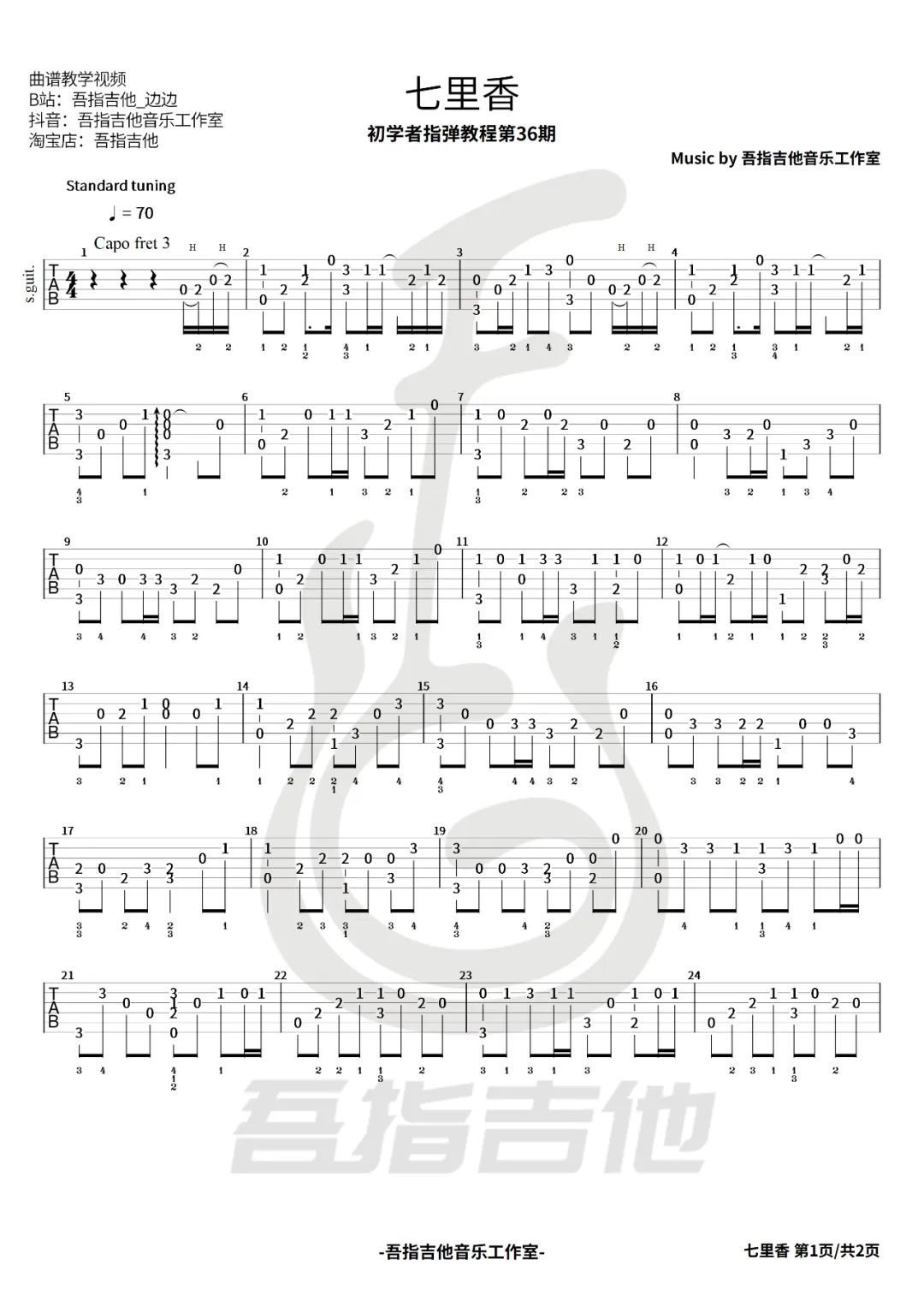 曲谱介绍: 七里香指弹吉他谱,根据周杰伦的歌曲所改编,旋律响起就是满满回忆杀,完全的代表青春了青春的味道 共有2张高清图片谱,随谱附《七里香》指弹演示+教学视频,弹奏速度控制在70BPM,节奏4/4拍,CAPO可夹3品弹奏本曲,难度3级较简单。本页下方还提供了曲谱的PDF版本下载哦! 指弹谱详情