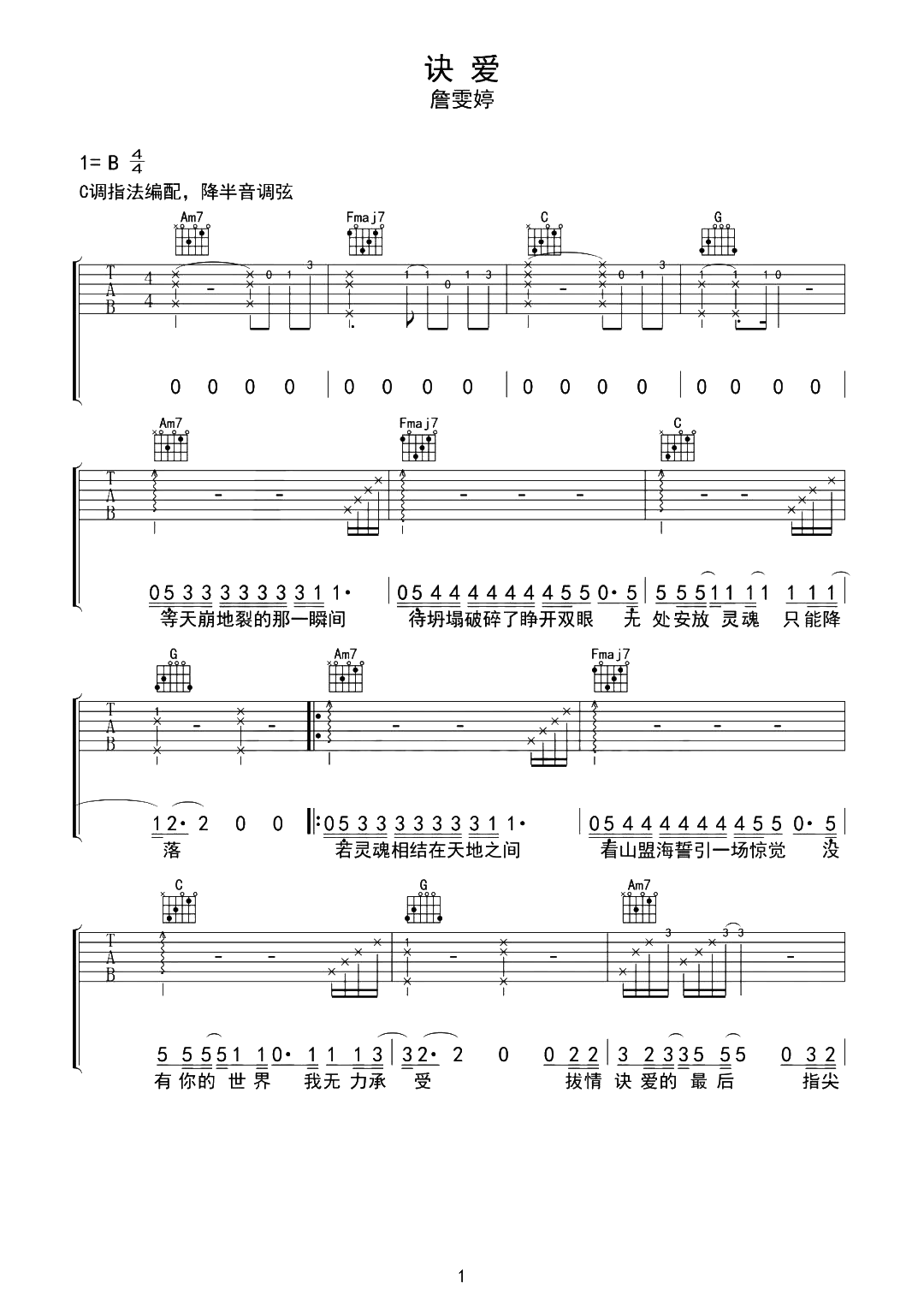 诀爱吉他谱 - 詹雯婷 - C调吉他弹唱谱 - 原版