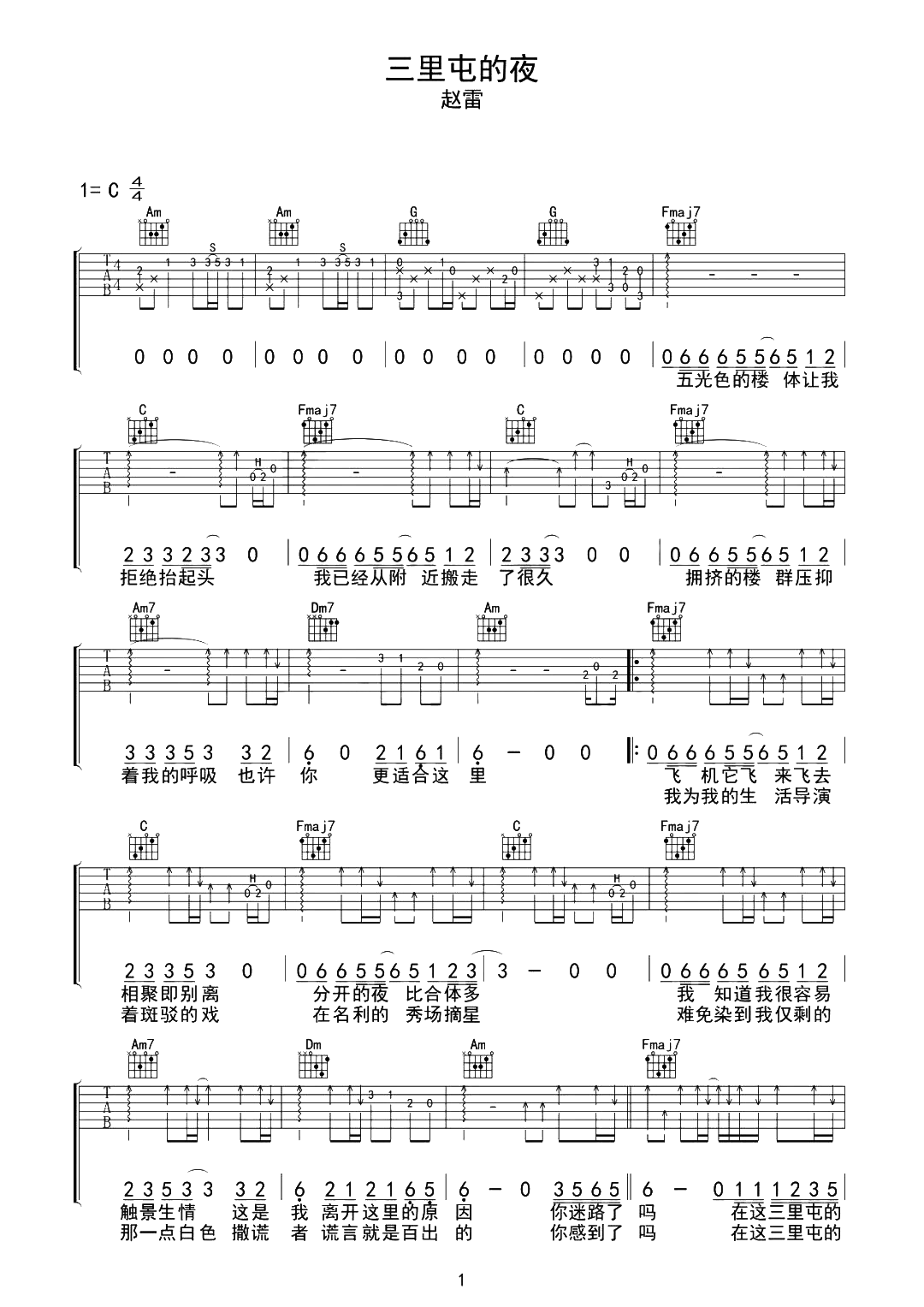 曲谱介绍: 《三里屯的夜》吉他谱,赵雷演唱,一首关于城市的歌,背景是写的关于北京城,但他没有置身其中而是以一个旁观者的态度在观摩;也许时常初入三里屯的人们,应该会被歌曲拉满共鸣。 《三里屯的夜》吉他弹唱谱,选用C调指法,节奏4/4拍,标准调音无需使用变调夹,带前奏原版编配,建议练习参考弹唱示范视频。另外本页下方附曲谱的PDF版本下载。