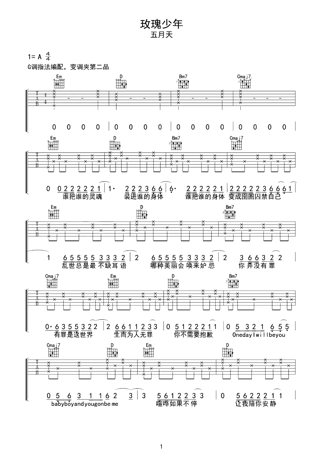 玫瑰少年吉他谱 - 五月天 - G调吉他弹唱谱 - 原版
