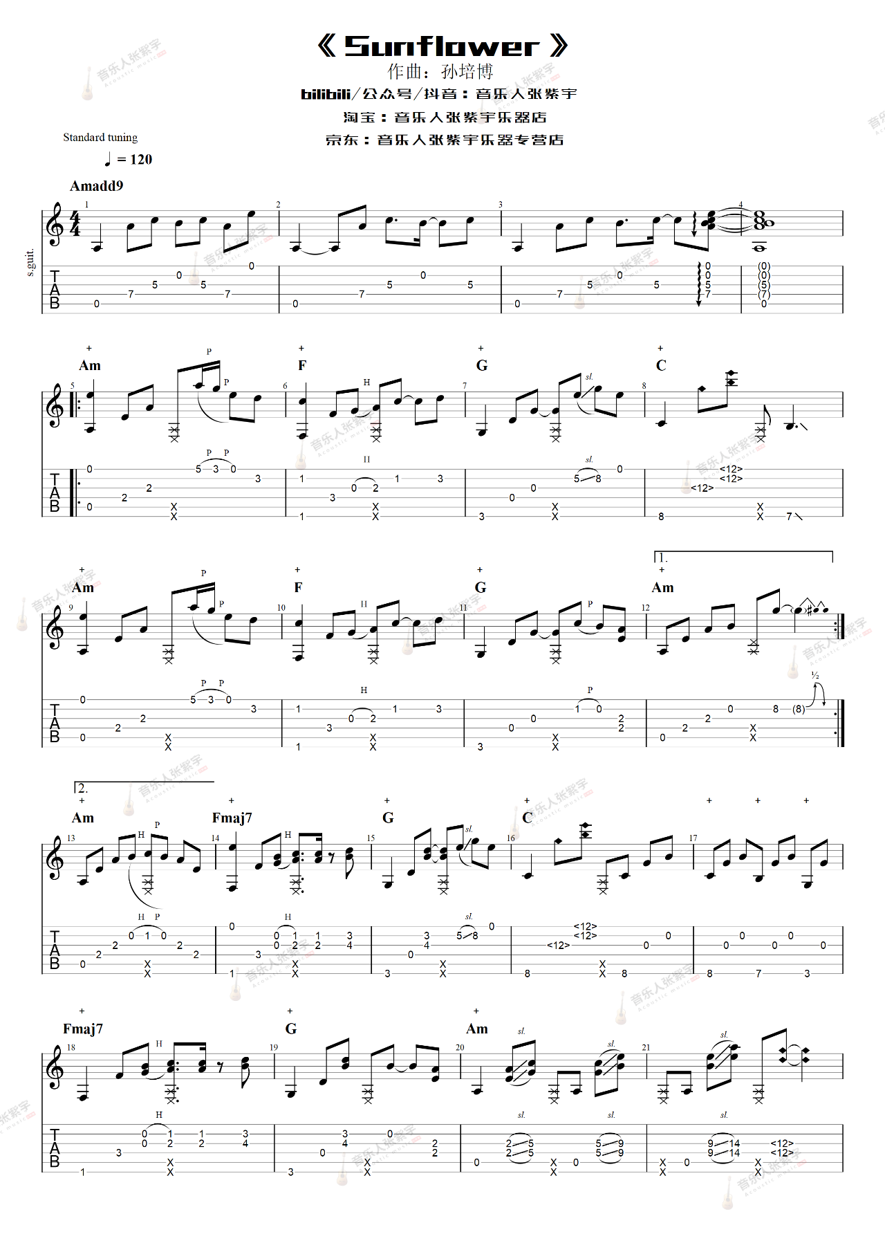 曲谱介绍: 指弹教学视频 《Sun flower》是一首来自孙培博老师的指弹歌曲,相信所有人最初听到这首歌时就被其美妙的旋律和它给人的一种蓬勃的力量那种感觉所深深吸引了,单曲循环了一天又一天,无论时隔多久都会那么记忆犹新。 sun flower指弹吉他谱,弹奏速度120BPM,节奏4/4拍,难度5级适中,随谱附演示和教学视频,建议参考着练习,也是入门必玩的指弹曲子,推荐练习。 指弹谱详情