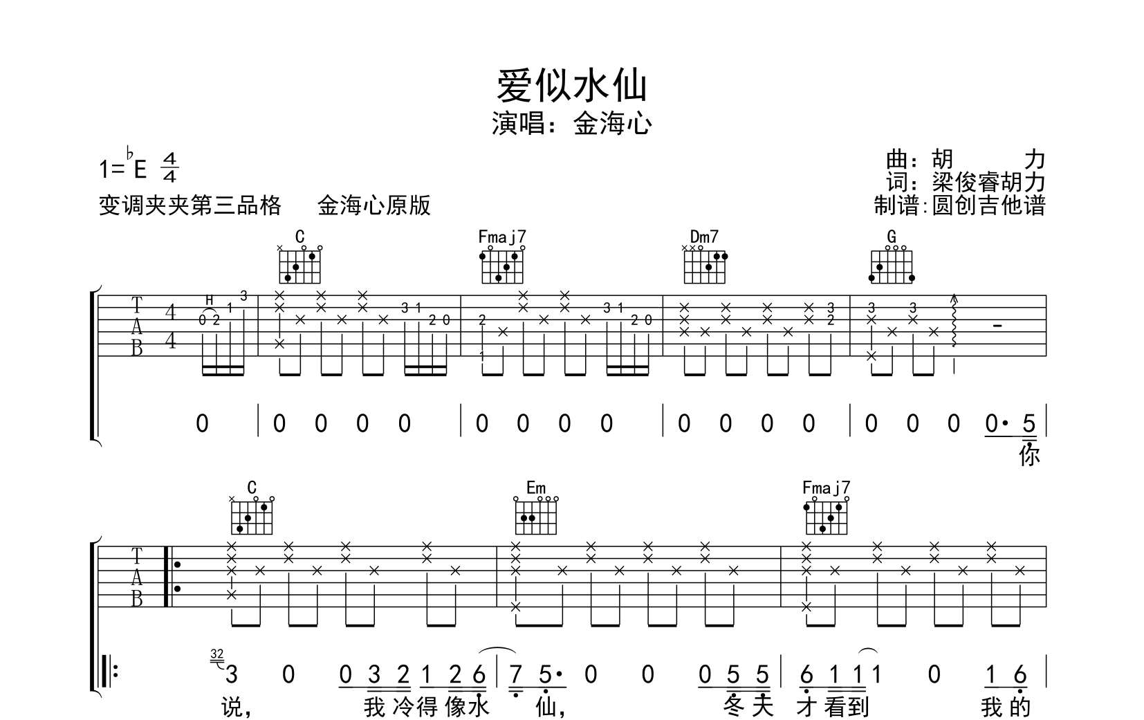曲谱介绍: 爱似水仙吉他谱,金海心演唱,《爱似水仙》吉他弹唱谱,歌曲采用C调指法弹唱,变调夹夹三品就是原调,旋律温婉,歌词借物抒情 ,由玩吉他www.wanjita.com整理上传,圆创吉他编配制谱,共有3张高清图片谱例。