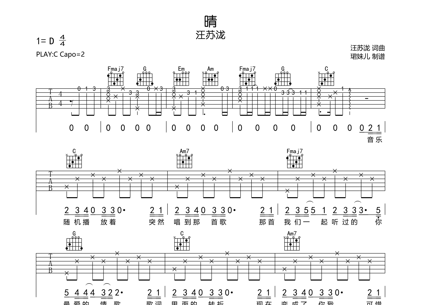 曲谱介绍: 晴吉他谱,汪苏泷演唱的歌曲,《晴》吉他弹唱谱,由珺妹儿编配制谱,本吉他谱采用C调指法编配,弹唱建议变调夹2品,速度85BPM,难度较简单,易上手,共有2张高清图片谱。