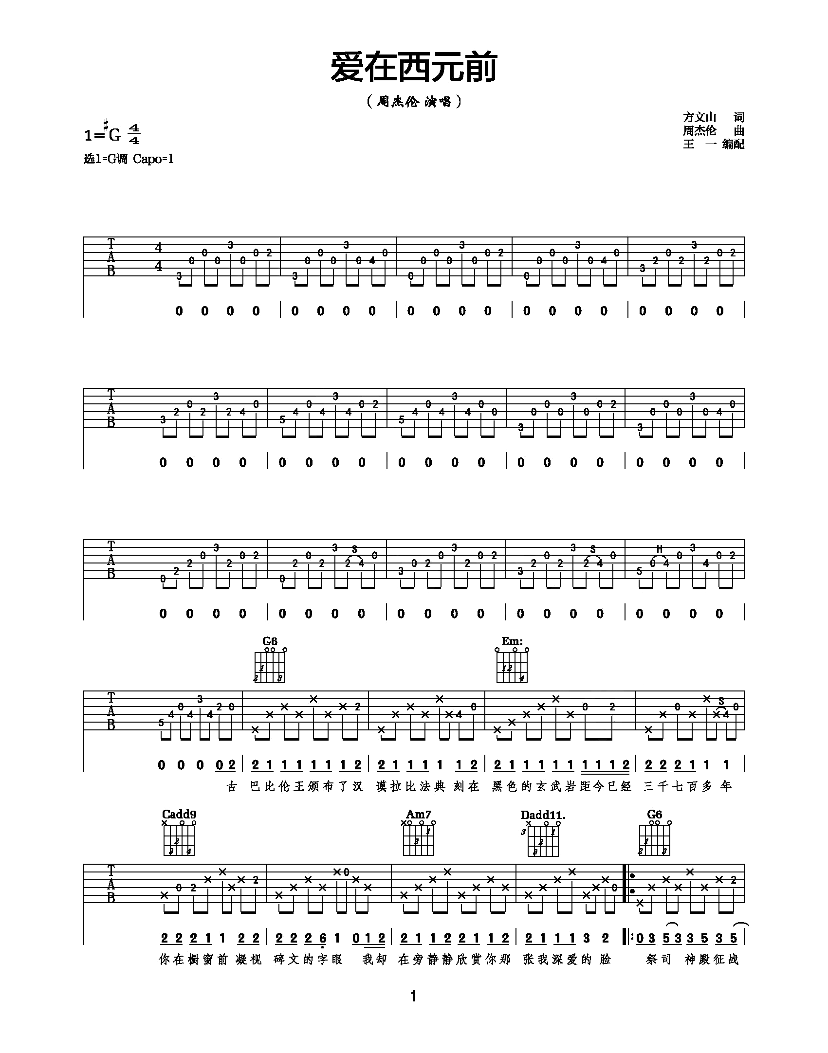 曲谱介绍: 《爱在西元前》由周杰伦演唱,跳动的美妙音符,勾勒出了古文明的画面,历经千年轮回只为遇见。经典的编曲和演唱背景当时如耳目一新般展现,哪怕时隔多年,这首歌曲的创意依然让人感叹留恋。 周杰伦《爱在西元前》吉他谱,选用G调指法,CAPO夹1品弹唱原调,节奏4/4拍,随谱附吉他演示教学视频,难度5级适中,本谱的指法连贯性要求较高,需多多练习。下方另外附曲谱PDF下载。