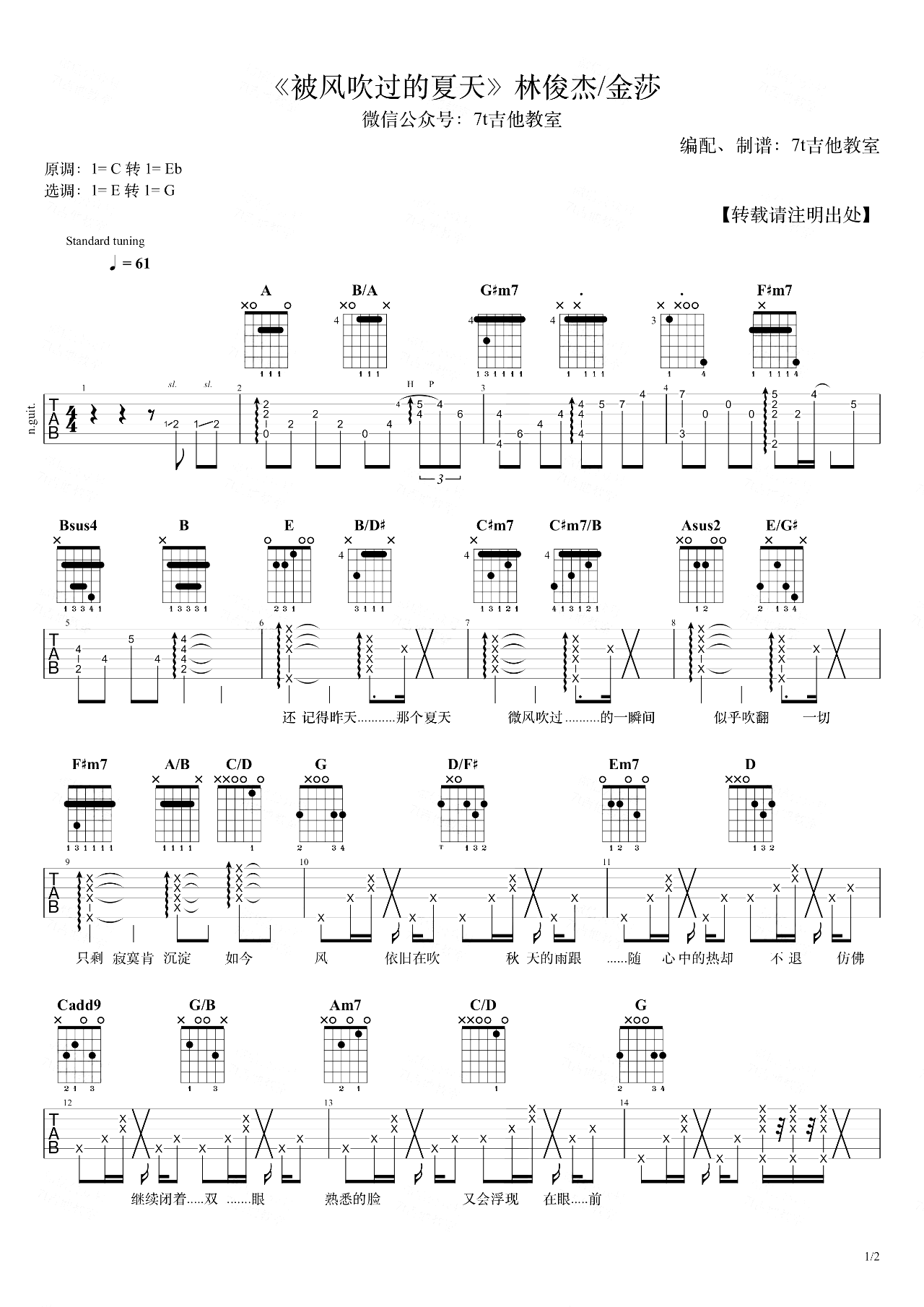 曲谱介绍: 《被风吹过的夏天》是由金莎和林俊杰合唱的歌曲。这首歌早已成为永远的经典,被粉丝誉为二人的“合情”之歌。如果在那青春懵懂年龄,唱着如此动人的情歌,也算见证了两人意义非凡的感情。 林俊杰/金莎《被风吹过的夏天》吉他谱,选用E转G调,原调C转bE调,随谱附弹唱示范视频,视频中为降半音调弦,然后夹1品弹唱,也就是标准调音。下方另外附本曲谱的PDF下载。