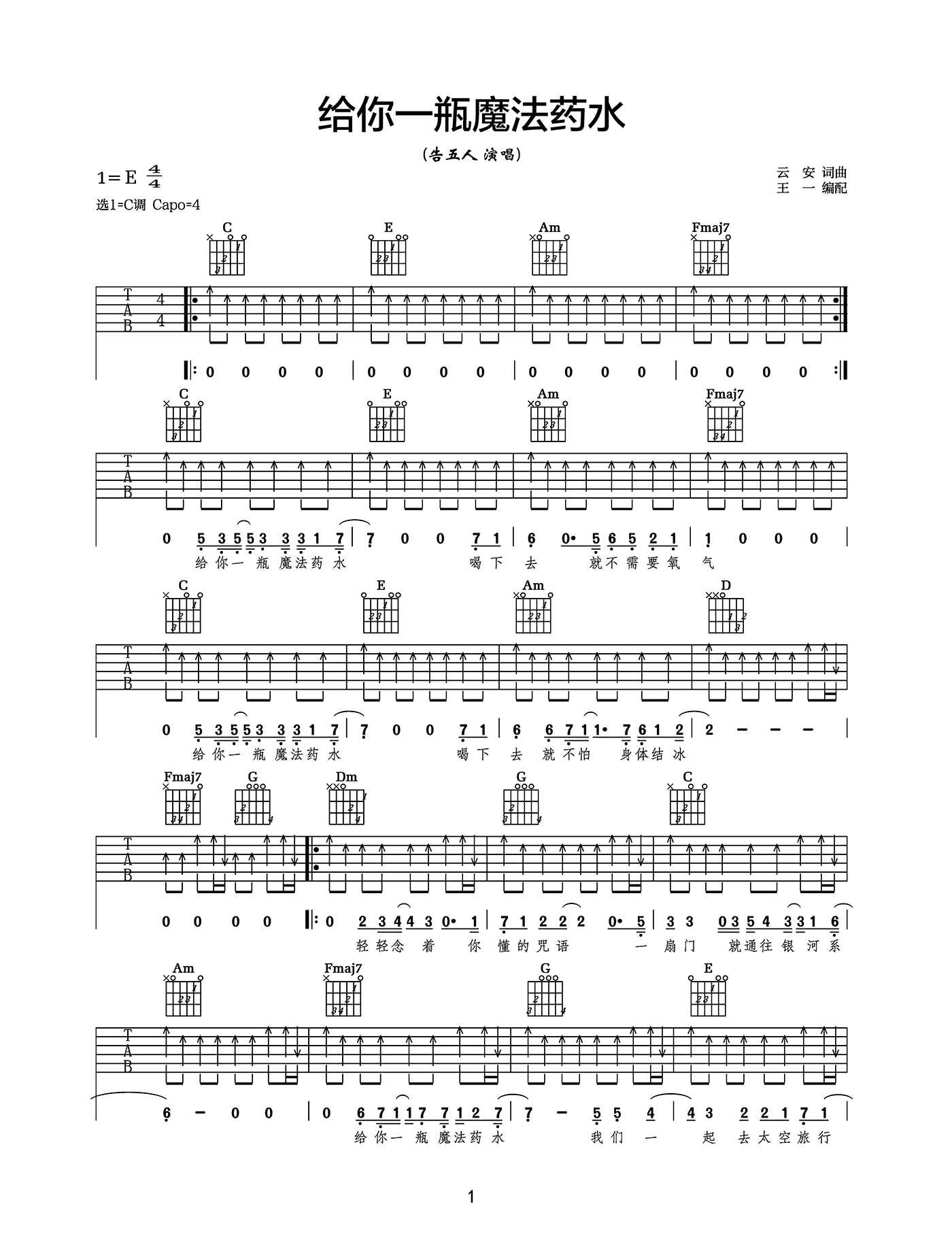 给你一瓶魔法药水吉他谱 - 告五人 - C调吉他弹唱谱 - 原版