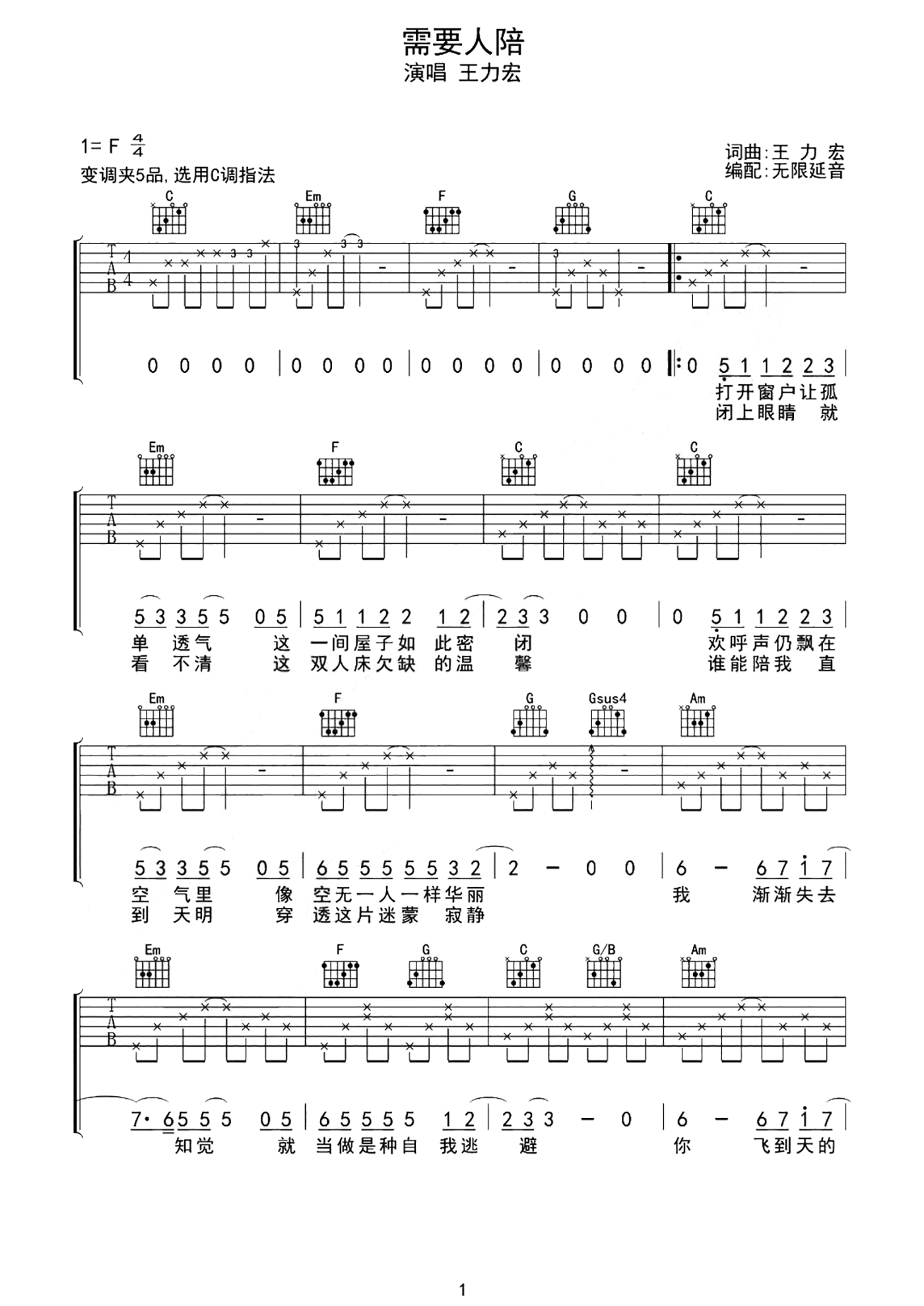 需要人陪吉他谱 - 王力宏 - C调吉他弹唱谱 - 原版