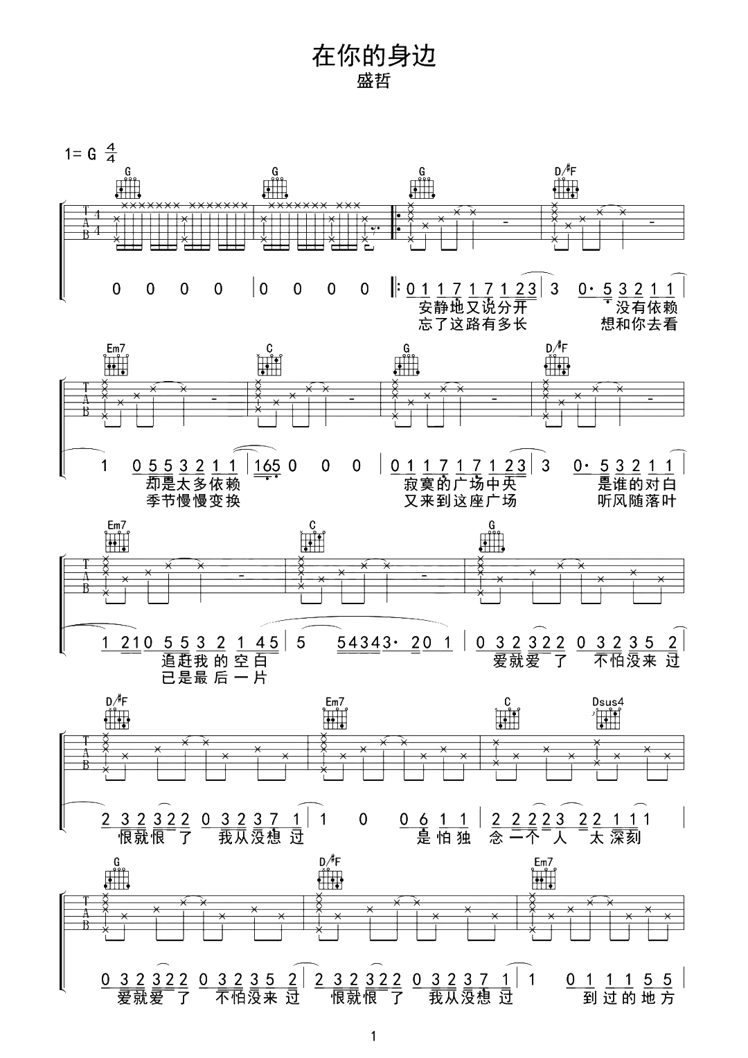 曲谱介绍: 《在你的身边》这首歌充满青春的召唤,那些时光尽管远去,但心间的距离从未走远。 《在你的身边》吉他谱,盛哲演唱,选用G调指法,标准调音,无需使用变调夹,带前奏原版编配,随谱附本曲谱的弹唱演示视频,供练习时参考。