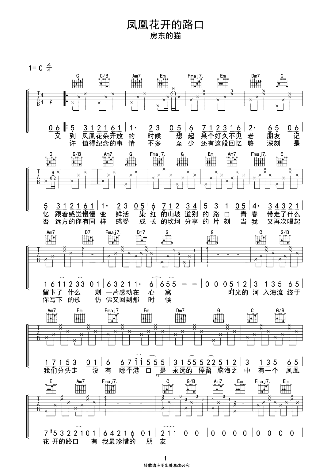 凤凰花开的路口吉他谱 - 房东的猫/孟慧圆 - C调吉他弹唱谱 - 原版