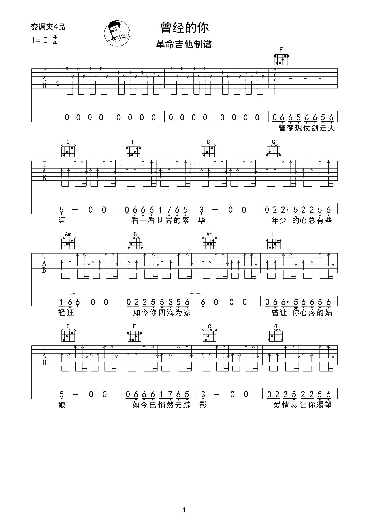 曲谱介绍: 曾经的你吉他谱,许巍标识性的代表歌曲,畅快明亮的节奏夹杂民谣与摇滚。 《曾经的你》吉他弹唱谱,选用C调,原调E调,随谱附《曾经的你》吉他弹唱演示+教学视频,供大家参考学习,共4张高清PNG图片谱,难度初级简单。