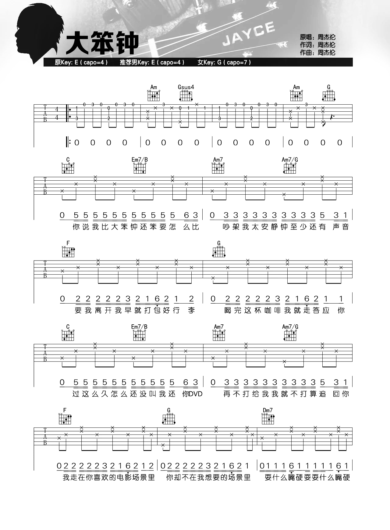 曲谱介绍: 《大笨钟》也许不是周杰伦大热情歌,又是网络将其翻热,歌曲带有一点点傲娇的的调调总让人回味,听到前奏总是会频频出戏,细腻的匹配似乎丝毫不太能挑出缺电,旋律舒适轻松明快,主歌虽说平平,但和弦走势很耐听。 大笨钟吉他谱,蓝莓吉他编配制谱并提供演示教学视频,曲谱共2张高清PNG图片谱,选用C调指法,男生弹唱原调E,CAPO夹4品即可,女生推荐夹7品,难度初级较简单。