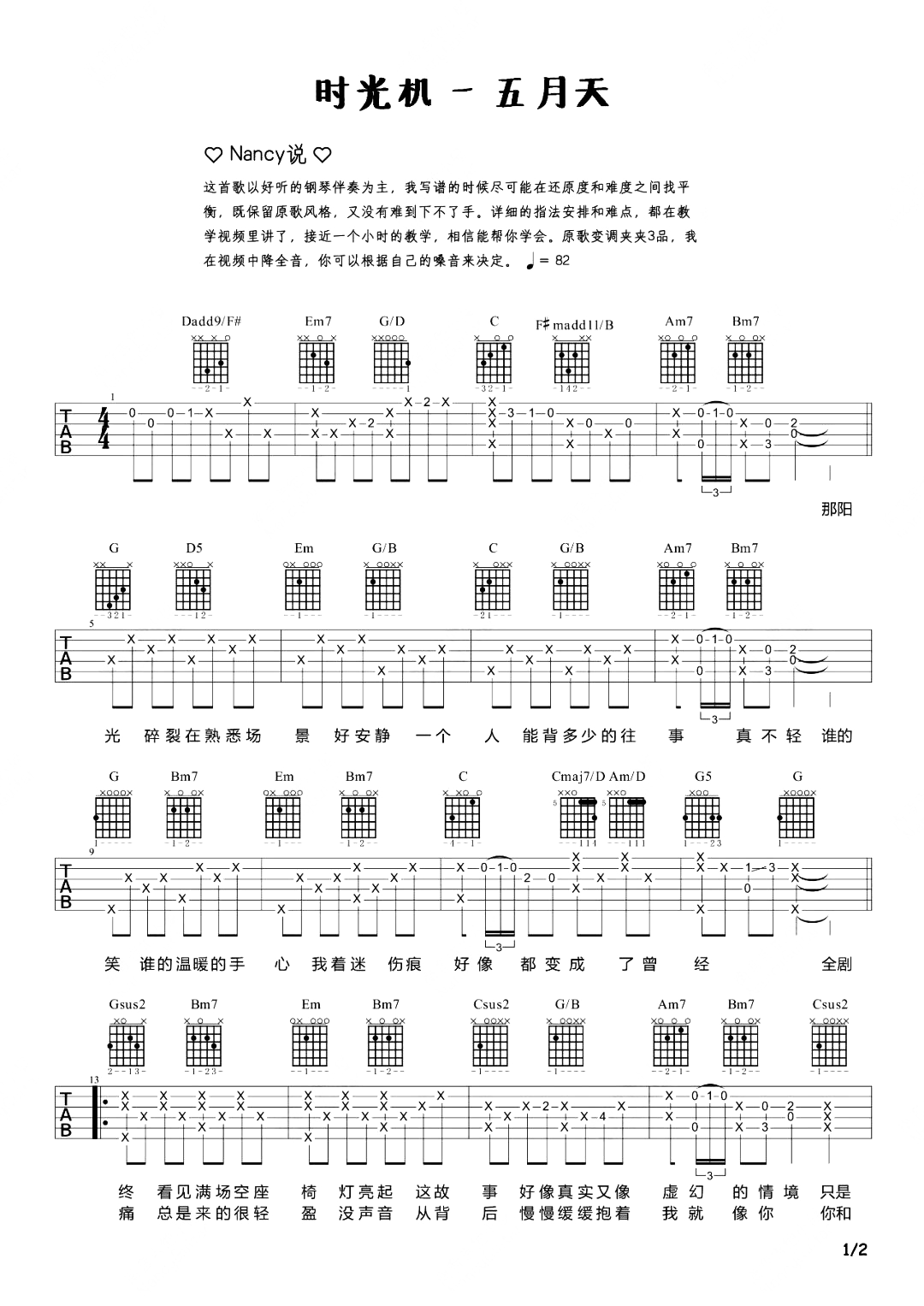 曲谱介绍: 时光机吉他谱,五月天演唱的抒情歌曲,原歌变调夹夹3品,节拍82BPM,共2张高清PNG图片谱,随谱附女生版吉他演示视频,让我们跟着南音老师听着舒适的音乐回到如梦般的当初,去感受曾经的点滴光阴。 《时光机》这首歌以好听的铜琴伴奏为主,本谱编配的时候尽可能在还原度和难度之间找平衡,既保留原歌风格,又没有难到下不了手。