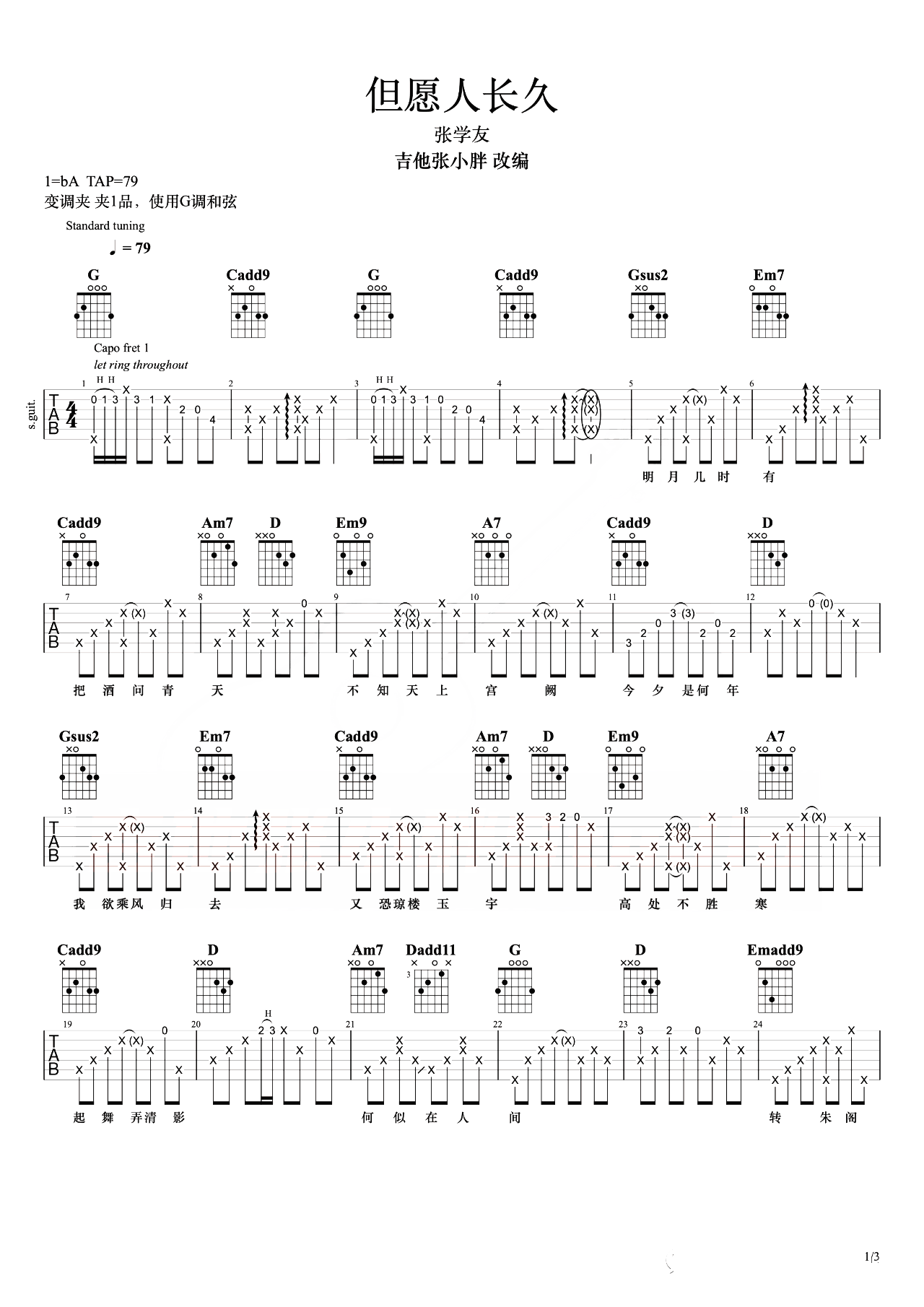 曲谱介绍: 但愿人长久吉他谱,张学友演唱的男版,歌曲取自水调歌头中的诗词句反复循环,舒缓的旋律让人感受到了人世间悲欢聚散,我们总希望缘分能够走得更远,而这首歌完整的诠释了对人生完整且美好的祈愿。 《但愿人长久》吉他弹唱谱,选用G调指法编配,原调bA,CAPO夹1品弹唱,速度79BPM,难度适中,版本编配较细,建议参考演示视频结合练习。