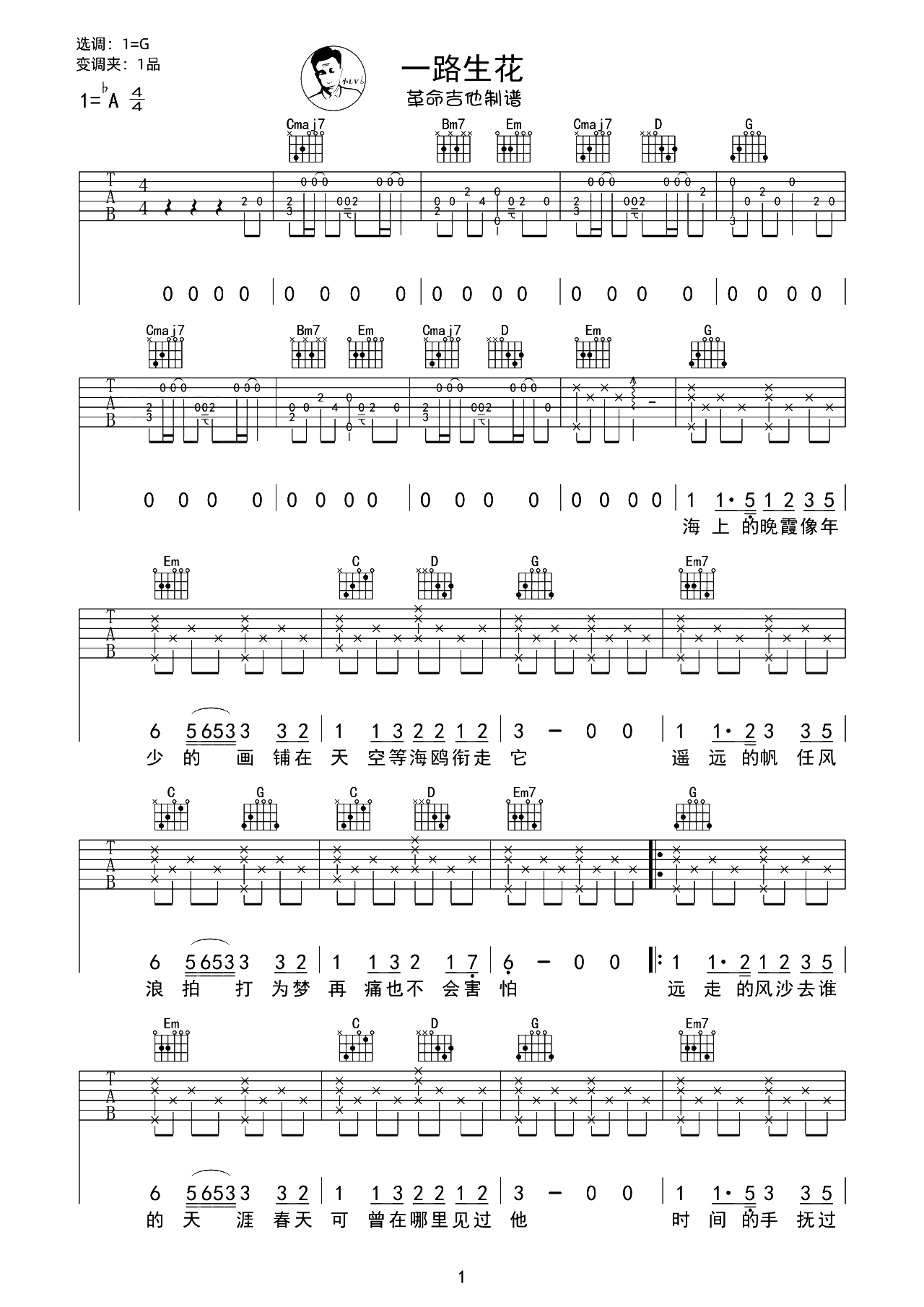 曲谱介绍: 温奕心的《一路生花》,畅快明亮的律动感,充满阳光且励志。 一路生花吉他谱,革命吉他制谱,选用G调,原调bA,CAPO夹1品弹回原调,节奏4/4拍,随谱附吉他演示+教学视频,大家可跟小lv老师一起练习。