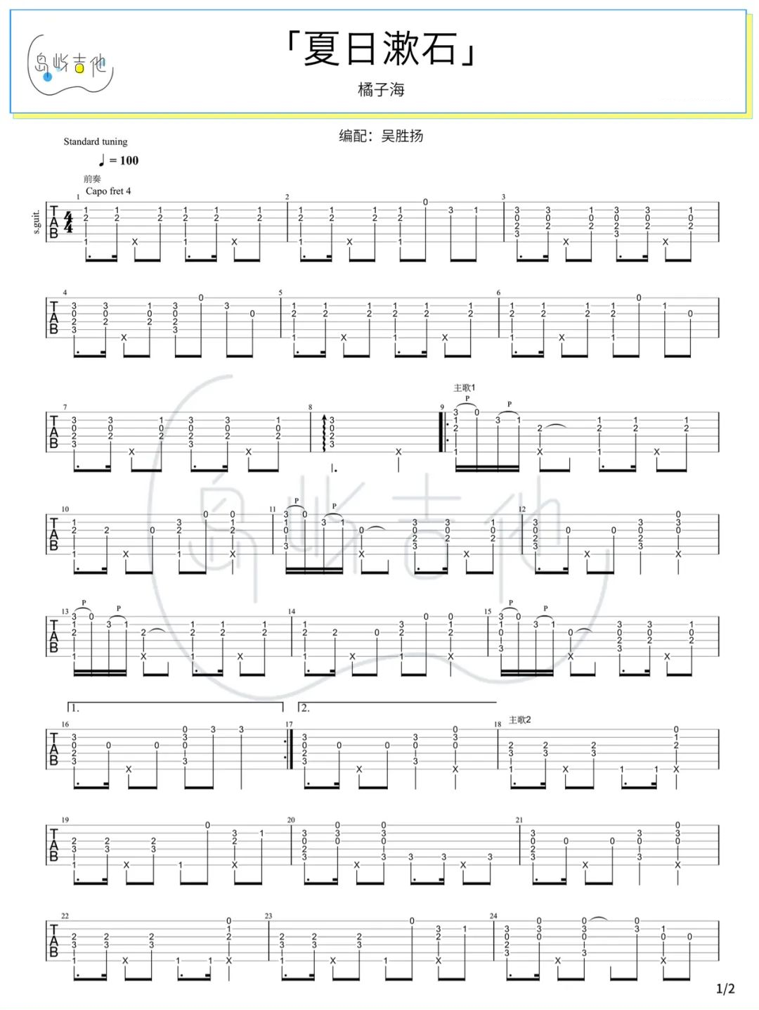 曲谱介绍: 《夏日漱石》指弹教学 《夏日漱石》歌曲的节奏和曲调非常的轻快和愉悦,让你觉得十分享受,进而会突然忘记所有的不美好,然后置身于浪漫与舒适的环境里,主要表达了即使你的生活一地鸡毛,你依然可以选择浪漫一生,在夏日来临前夕,备好吉他去弹出一整个盛夏! 夏日漱石指弹谱,共2张高清PNG图片谱,CAPO建议夹4品,速度100BPM,节奏4/4拍,随谱附《夏日漱石》指弹演示+教学视频,便于感兴趣的朋友上手练习。 指弹谱详情