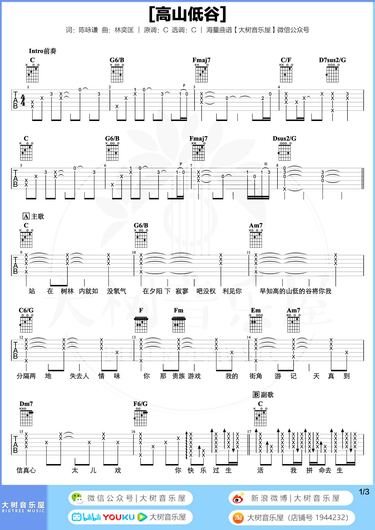 曲谱介绍: 林奕匡《高山低谷》,非常好听的粤语歌曲,舒适之中感受到了情绪的起伏,感情生活就如歌曲所述一样,我们总会遇到人生的光点,也会遇到崎岖坎坷,犹如高山与低谷的崎岖连绵围绕在我们身边。 林奕匡《高山低谷》吉他谱,由大树音乐屋编配,共3张高清六线谱+1张和弦谱,选用C调指法,男生可不用变调夹,CAPO女生可夹4品,弹唱E调,随谱附《高山低谷》女生版吉他弹唱演示视频,大家可参考练习。