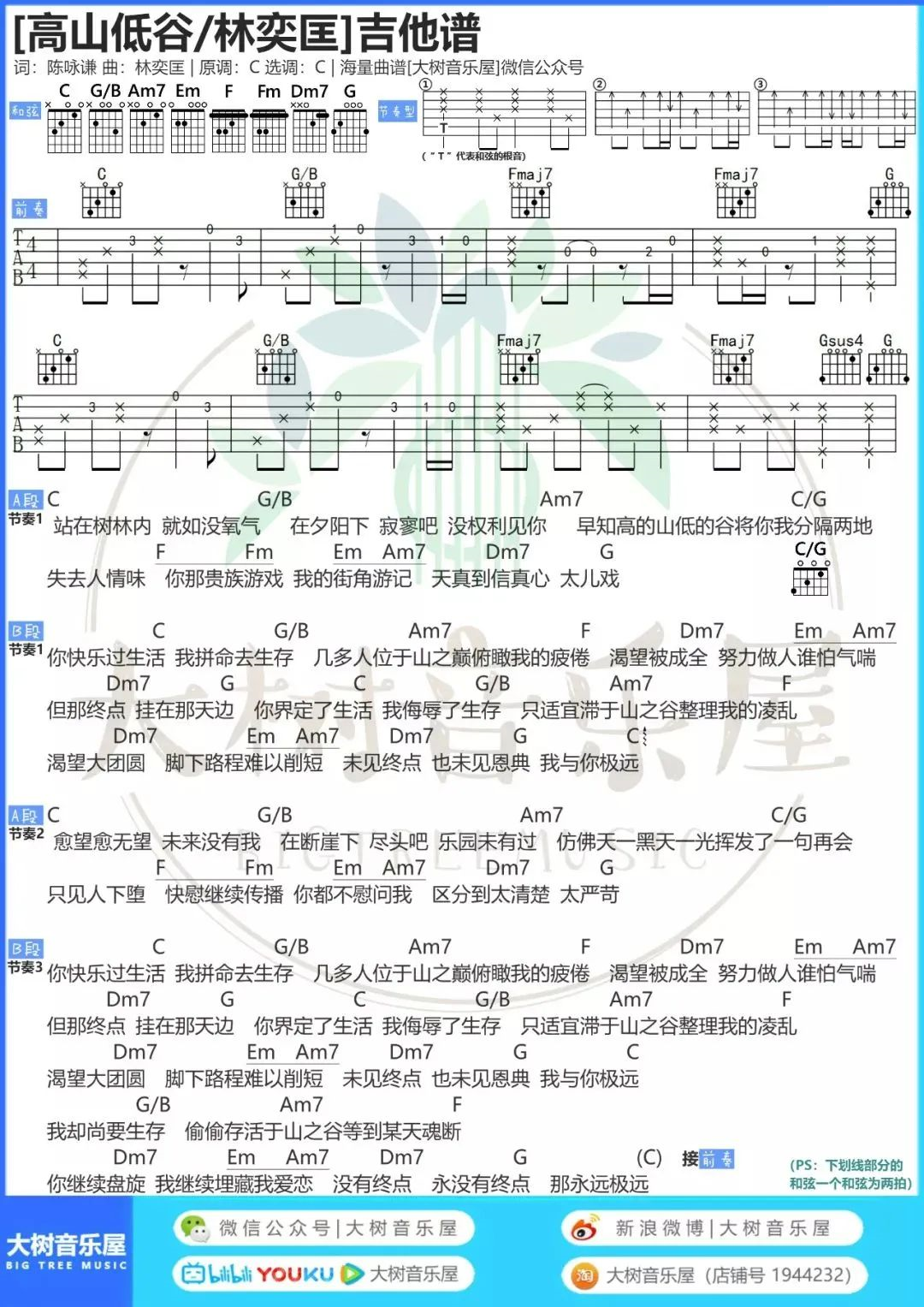 曲谱介绍: 林奕匡《高山低谷》,非常好听的粤语歌曲,舒适之中感受到了情绪的起伏,感情生活就如歌曲所述一样,我们总会遇到人生的光点,也会遇到崎岖坎坷,犹如高山与低谷的崎岖连绵围绕在我们身边。 林奕匡《高山低谷》吉他谱,由大树音乐屋编配,共3张高清六线谱+1张和弦谱,选用C调指法,男生可不用变调夹,CAPO女生可夹4品,弹唱E调,随谱附《高山低谷》女生版吉他弹唱演示视频,大家可参考练习。