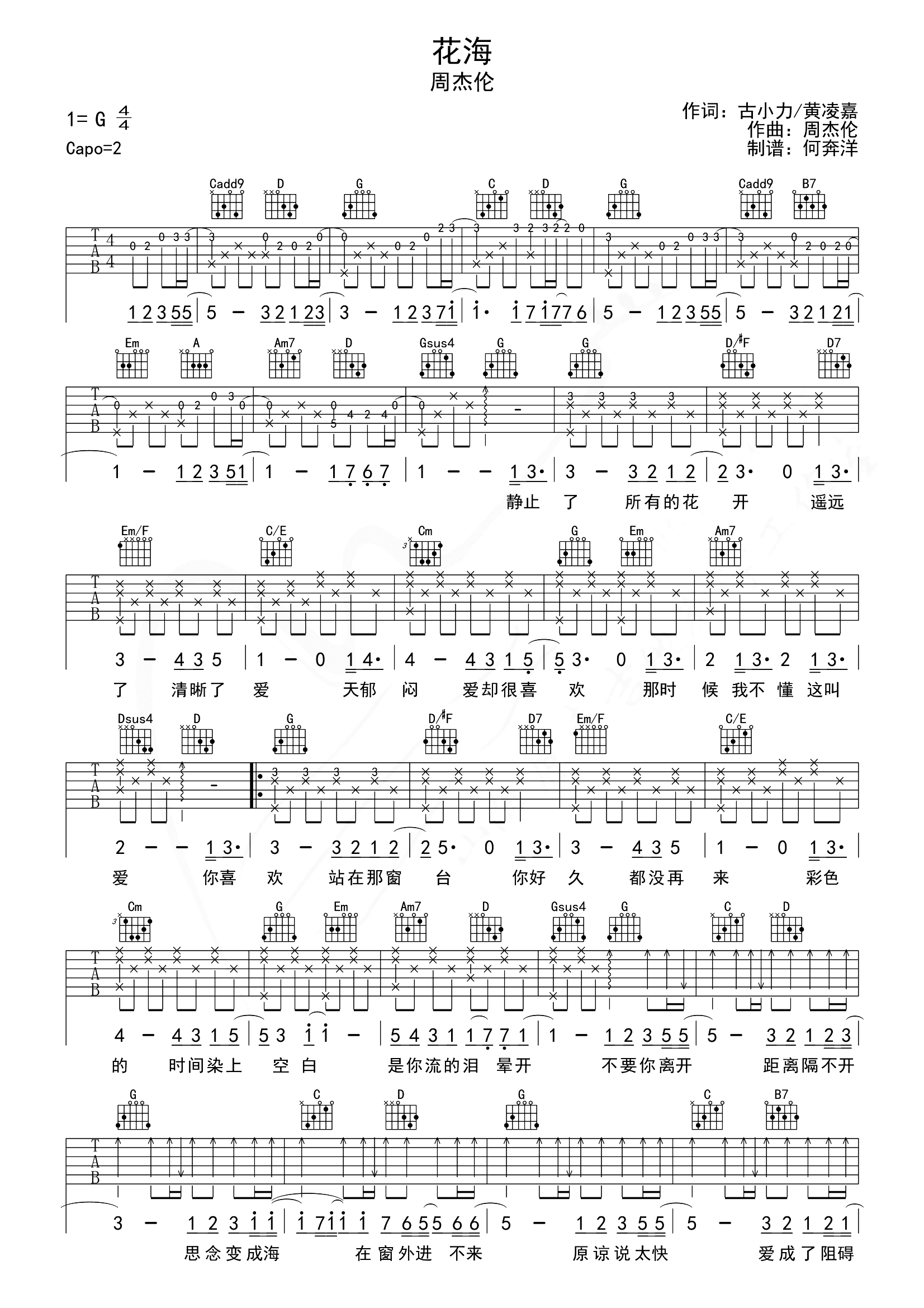 曲谱介绍:   周杰伦《花海》吉他谱,附完整弹唱音频,选用G调指法编配,原调A调,CAPO夹2品弹回原调,本谱按原版还原含前奏+尾奏,共2张高清PNG图片谱例,难度适中。