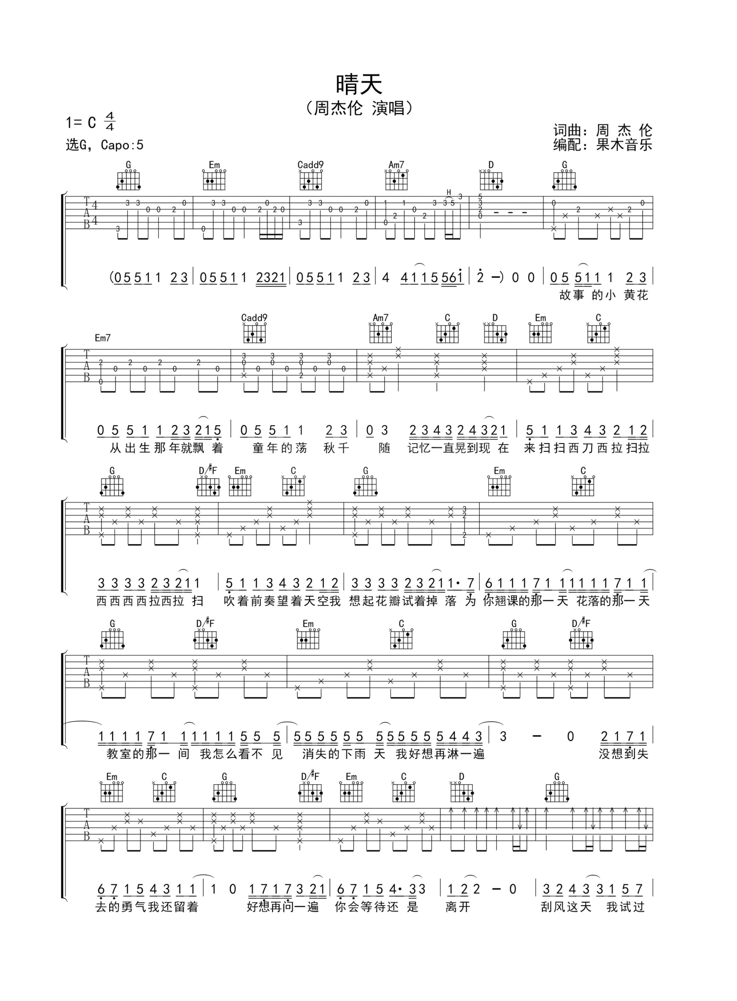 晴天吉他谱 - 周杰伦 - G调吉他弹唱谱
